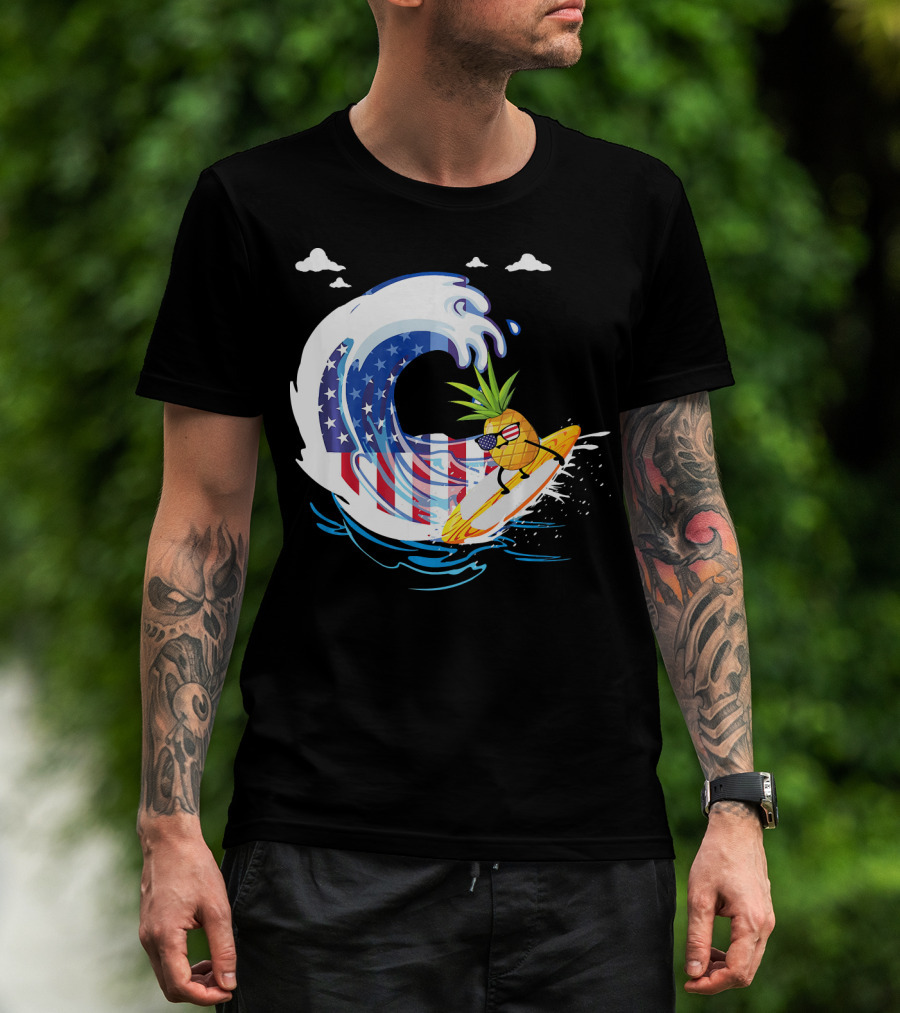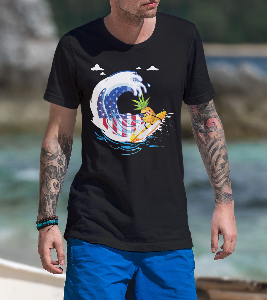Pineapple Surfing American Flag Wave Hawaiian T-Shirt
