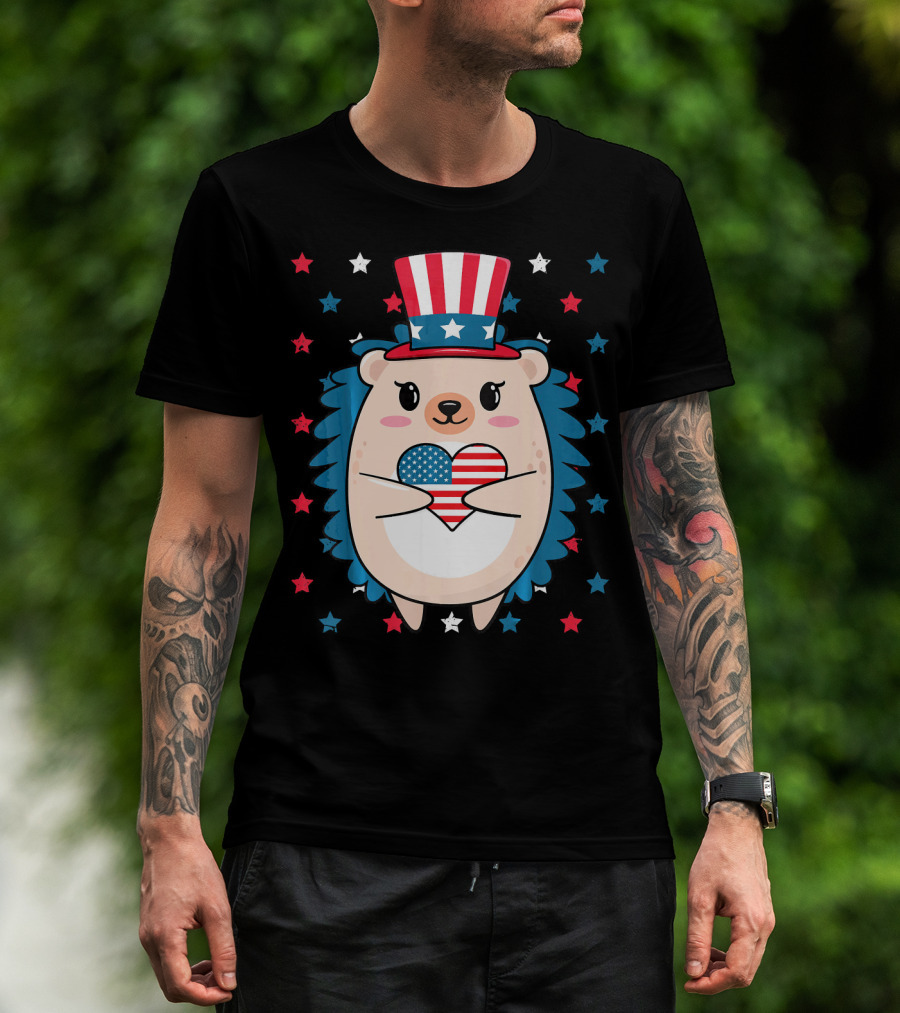 Hedgehog Patriotic Stars Uncle Sam Hat Holding USA Flag Heart T-Shirt