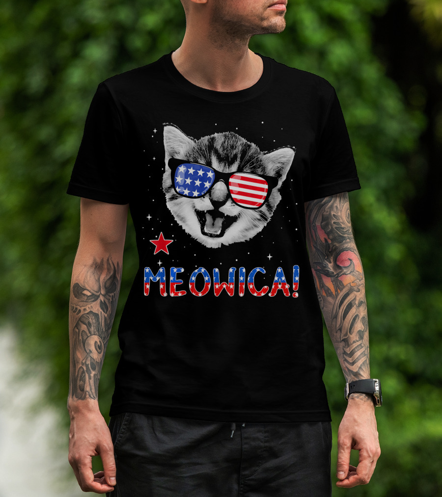 Meowica Cat With American Flag Glasses And Stars T-Shirt