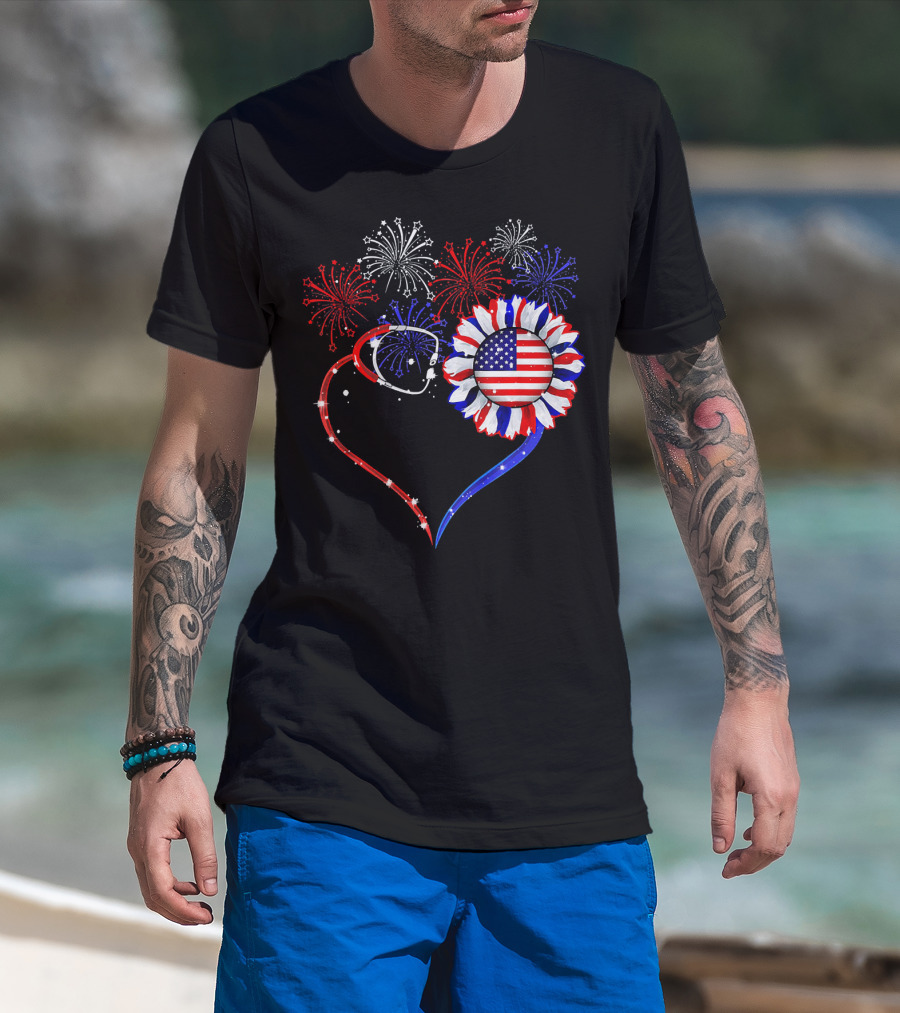 Nurse Heart Stethoscope Sunflower American Flag Fireworks T-Shirt
