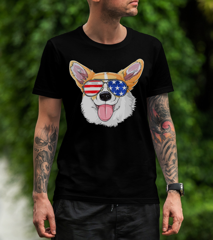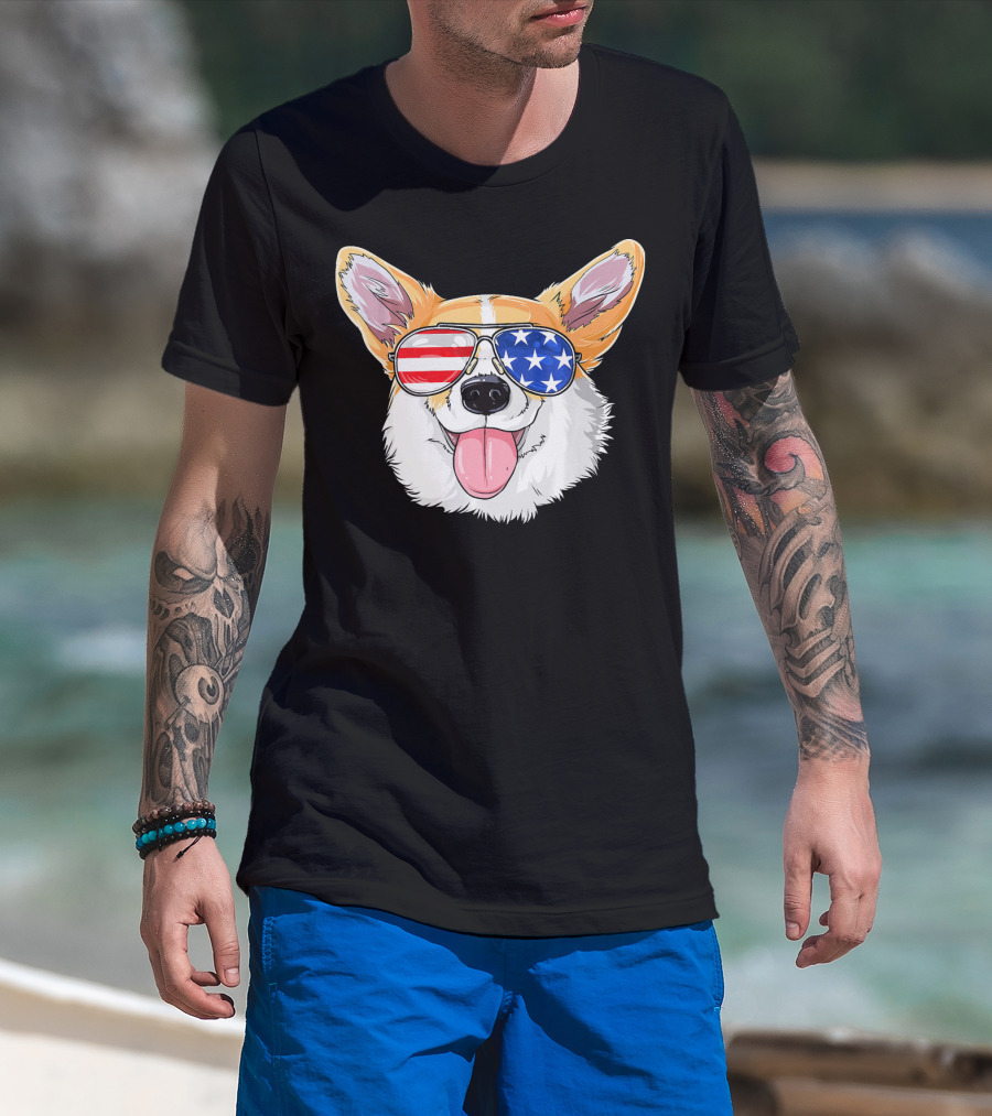 Patriotic Corgi With American Flag Sunglasses T-Shirt