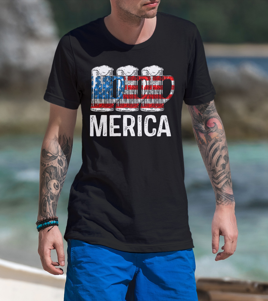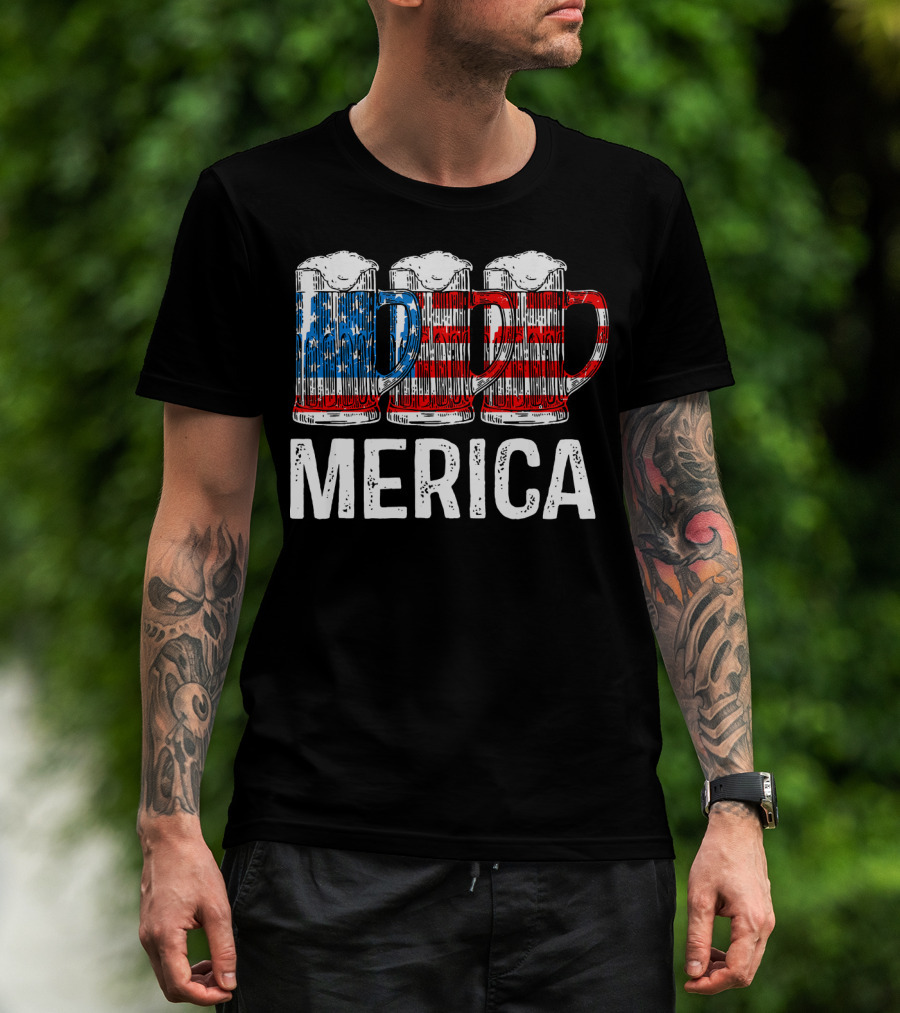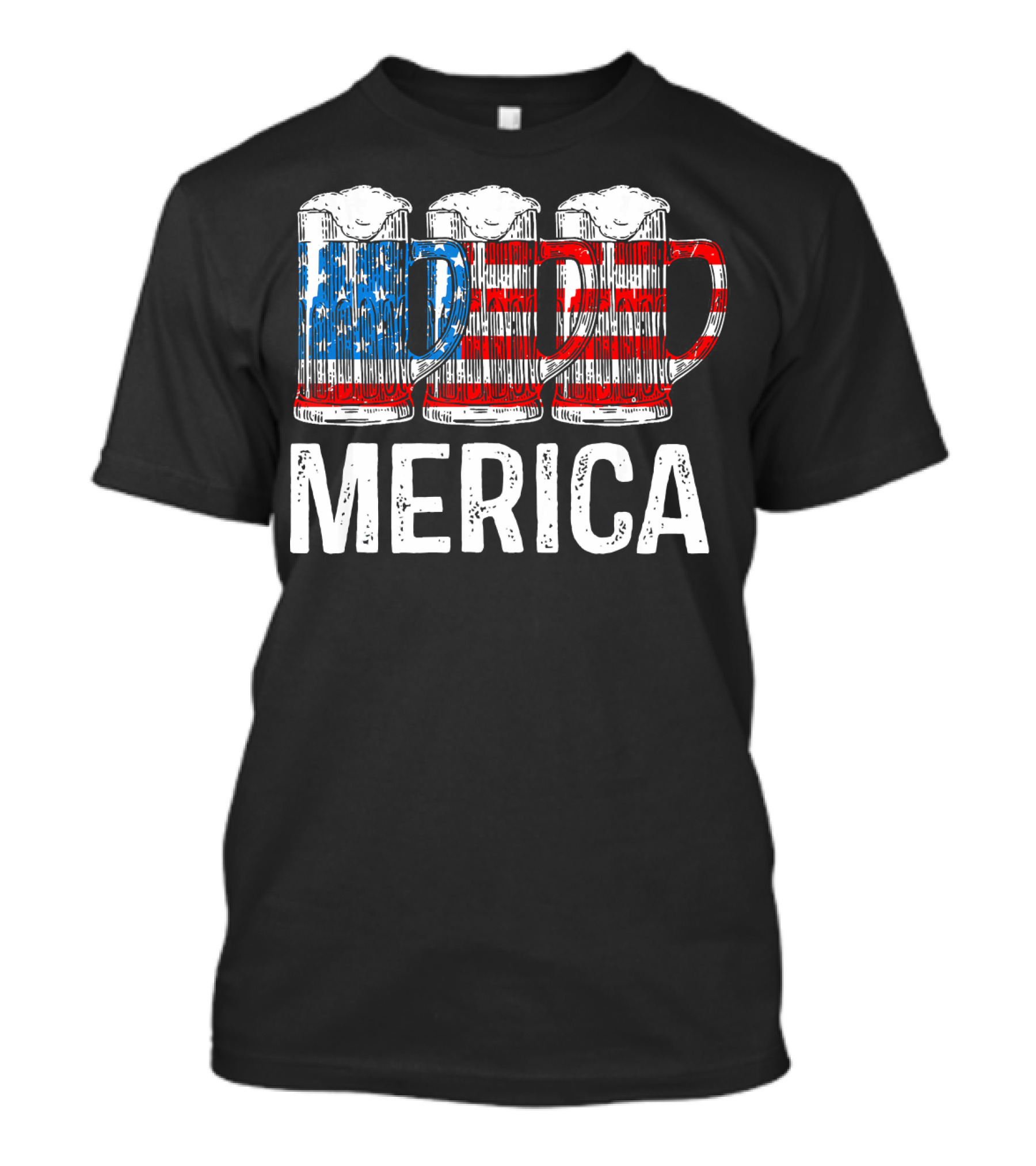 The Merica Beer Mugs with American Flag T-shirt is designed for everyday wear and a consistent fit. Fabric is pre-shrunk ring-spun cotton with durable stitching. See the size chart below for exact measurements.