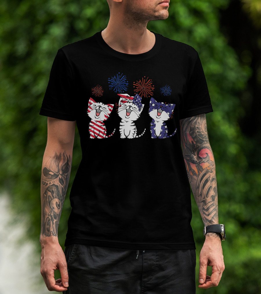 Red White Blue Cats America Celebration Fireworks T-Shirt