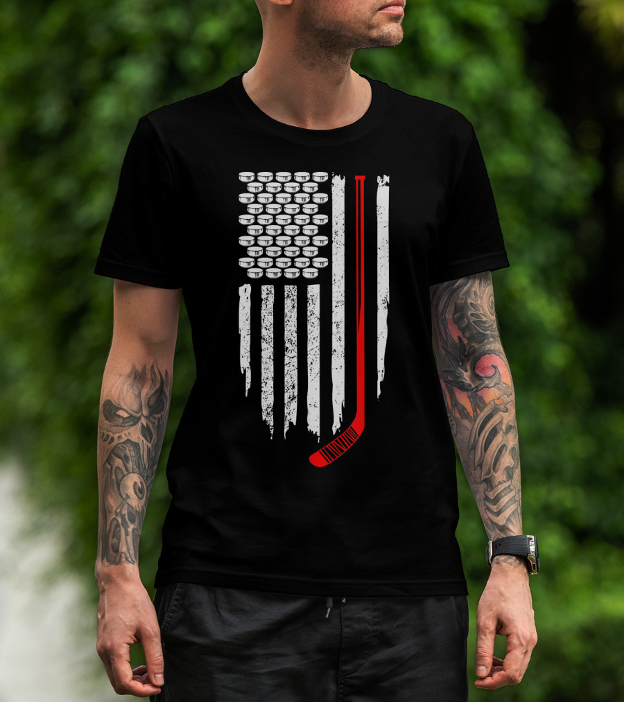Patriotic Hockey Flag Design With Red Hockey Stick And Puck Stars T-Shirt