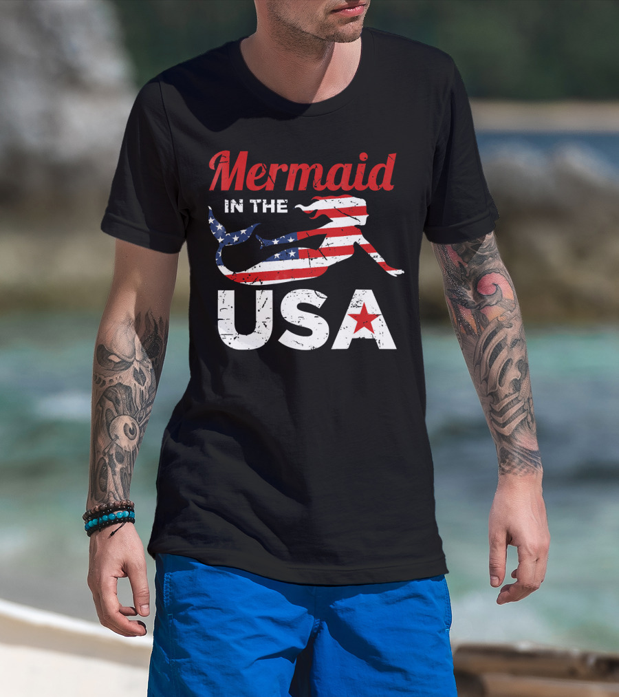 The Mermaid In The USA American Flag T-shirt is designed for everyday wear and a consistent fit. Fabric is pre-shrunk ring-spun cotton with durable stitching. See the size chart below for exact measurements.