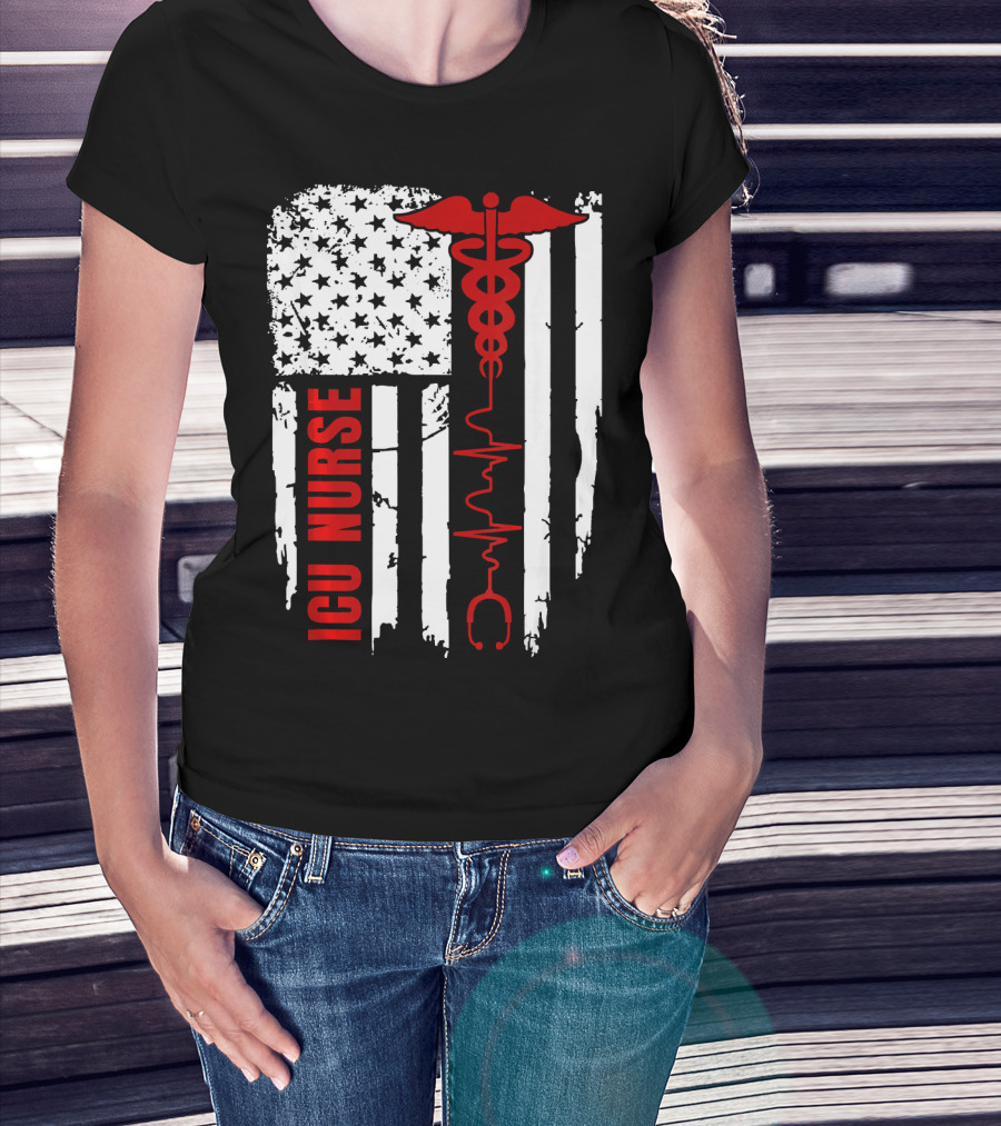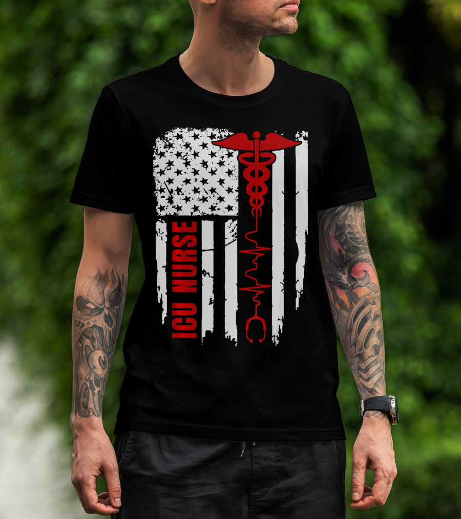 ICU Nurse American Flag Caduceus Heartbeat T-Shirt