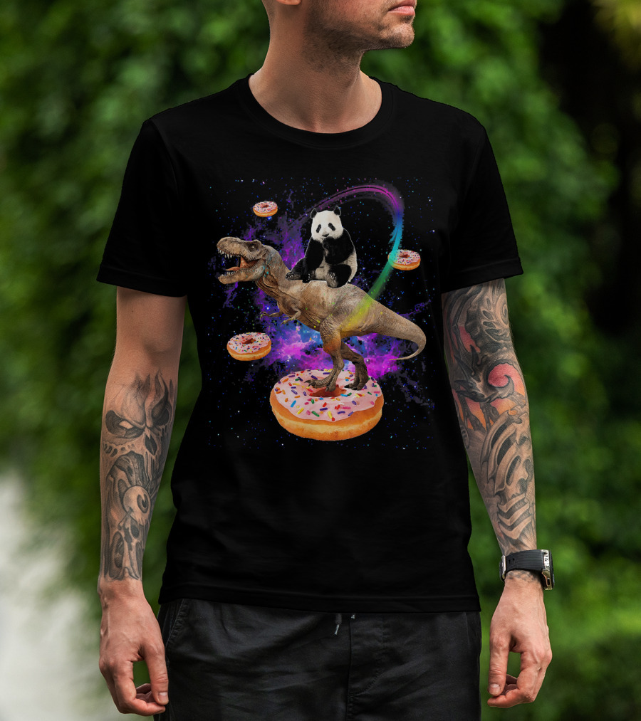 Space Panda Riding T-Rex On Sprinkled Donuts In Galaxy T-Shirt