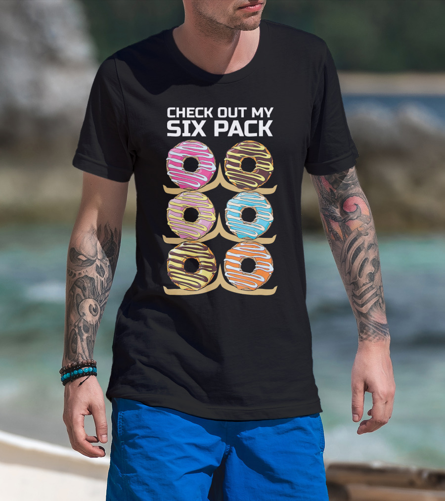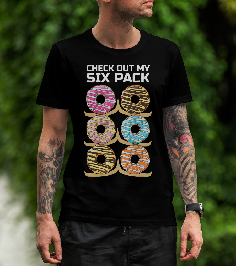 The Check Out My Six Pack Donut Humor T-shirt is designed for everyday wear and a consistent fit. Fabric is pre-shrunk ring-spun cotton with durable stitching. See the size chart below for exact measurements.