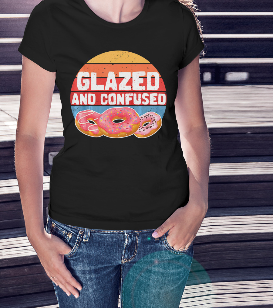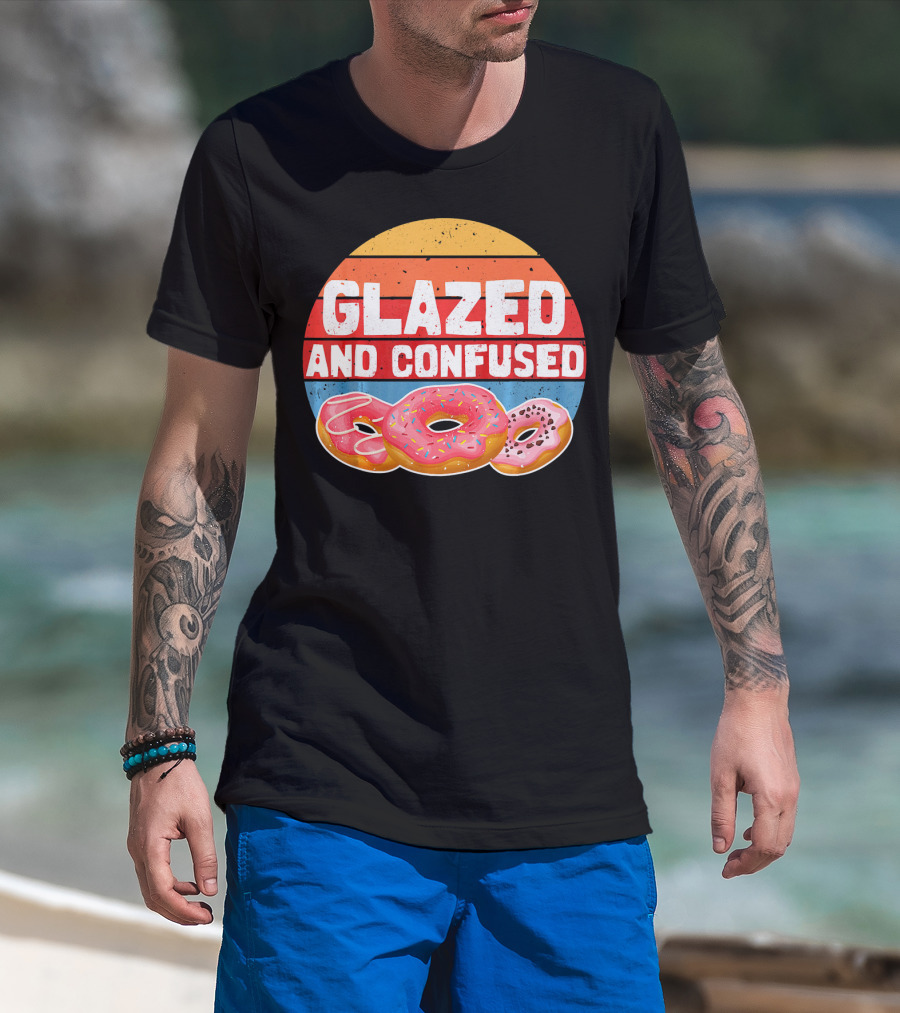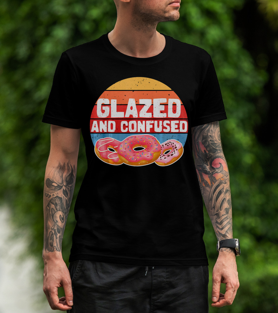The Glazed and Confused Funny Donut Retro Sunset Circle T-shirt is designed for everyday wear and a consistent fit. Fabric is pre-shrunk ring-spun cotton with durable stitching. See the size chart below for exact measurements.
