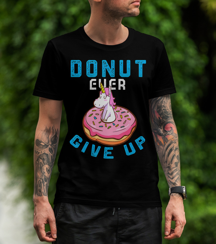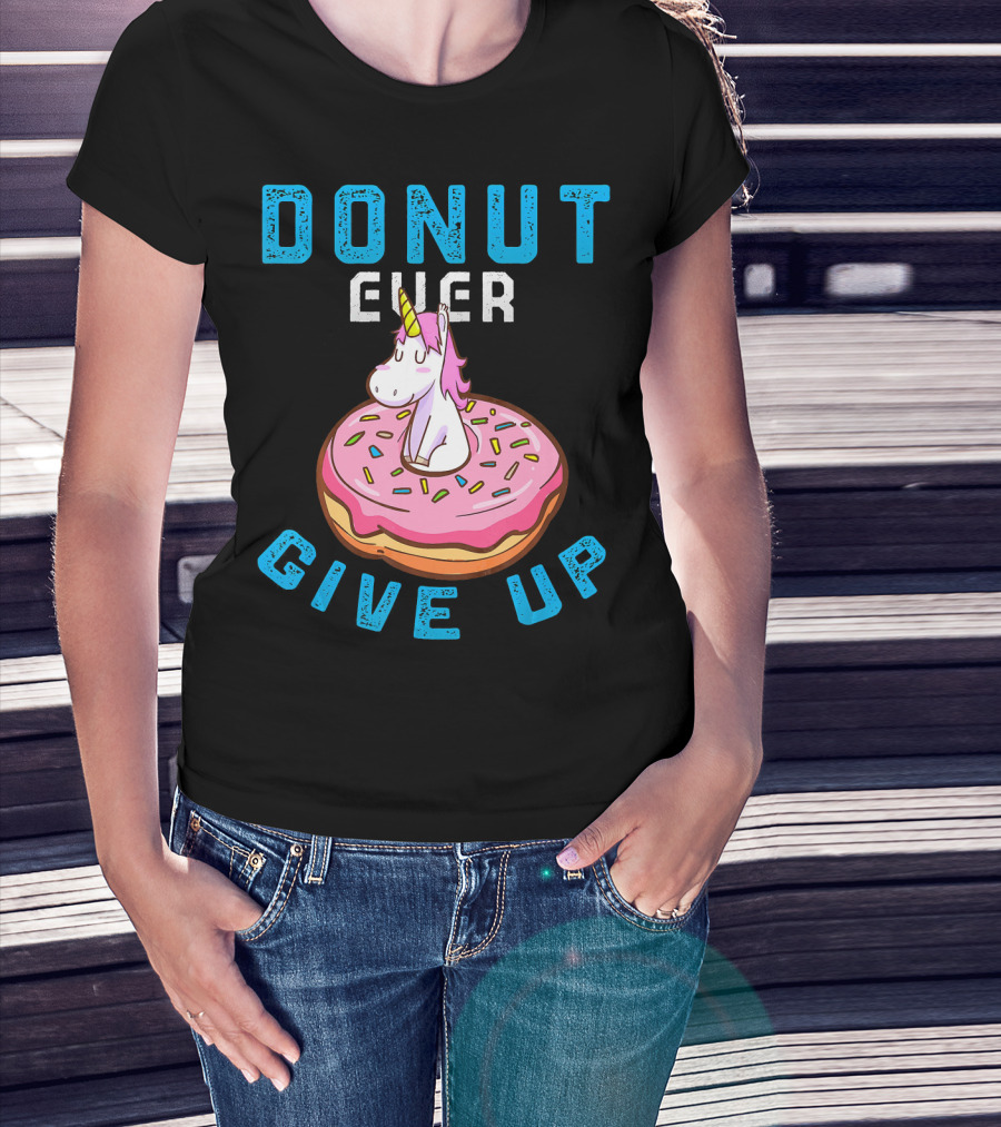 Donut Ever Give Up Unicorn With Pink Frosted Donut Fun Motivational T-Shirt