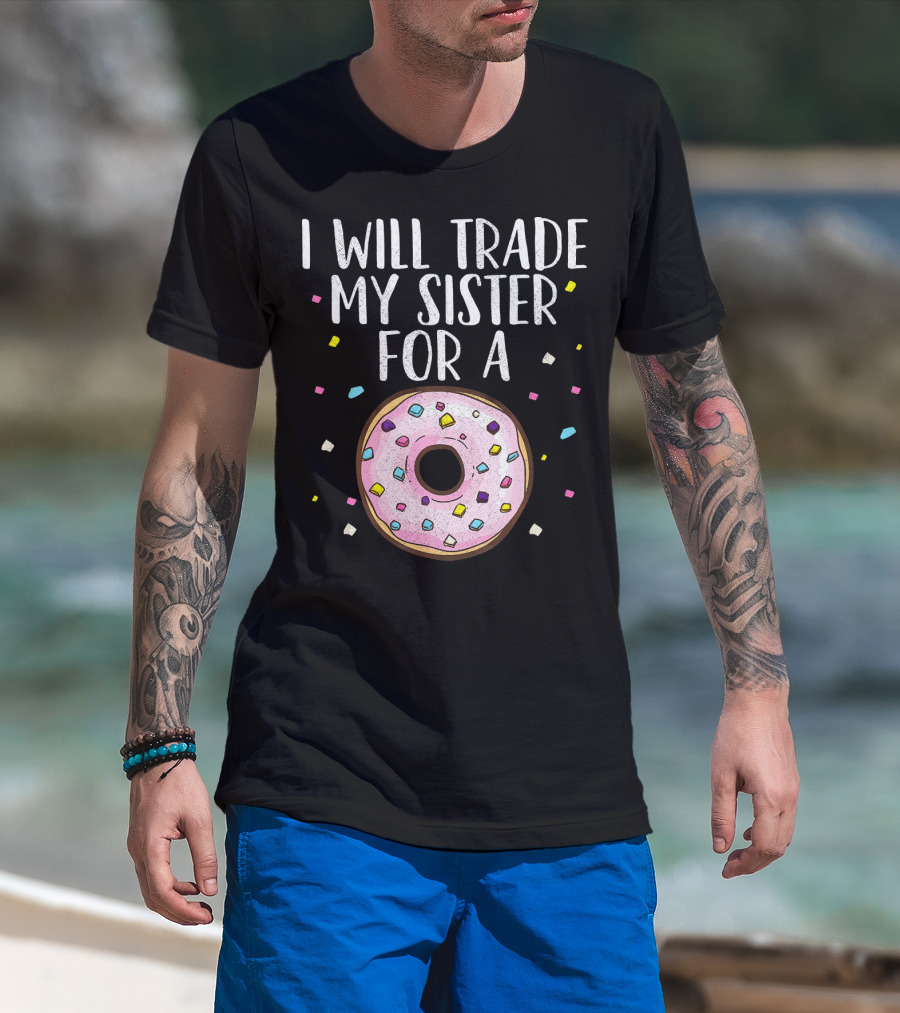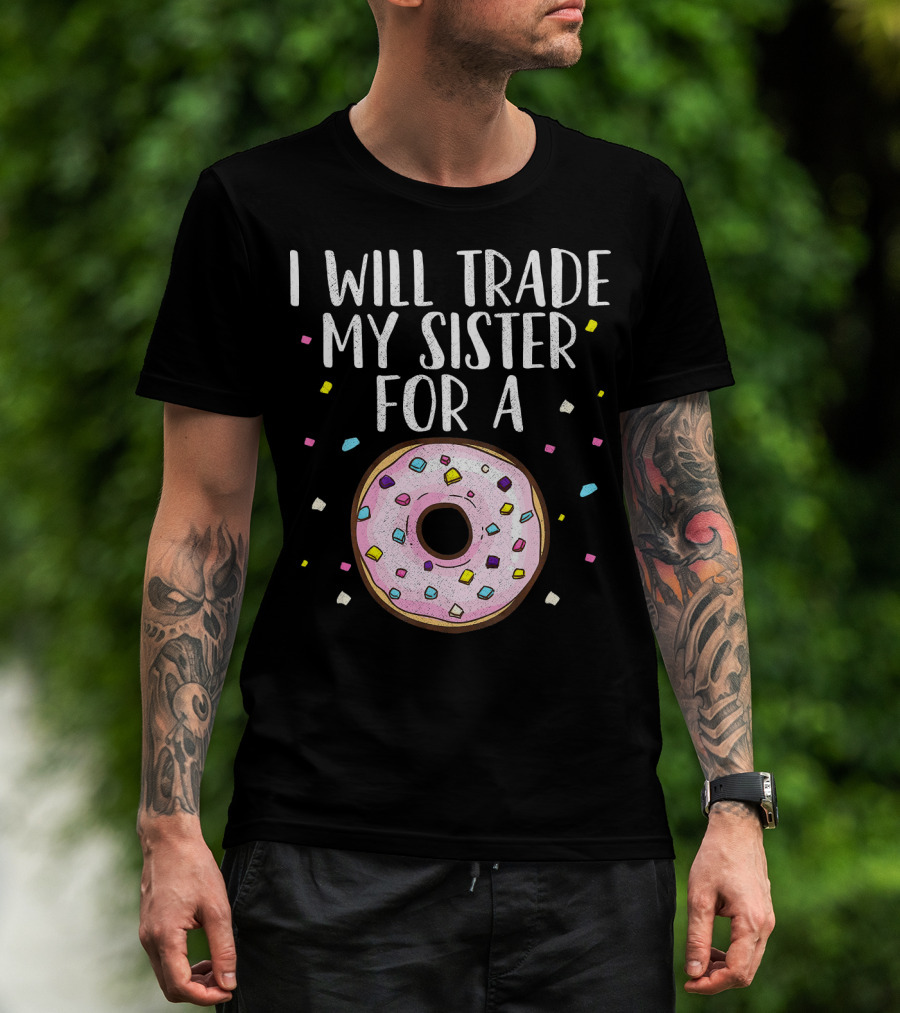 The I Will Trade My Sister For A Donut T-shirt is designed for everyday wear and a consistent fit. Fabric is pre-shrunk ring-spun cotton with durable stitching. See the size chart below for exact measurements.