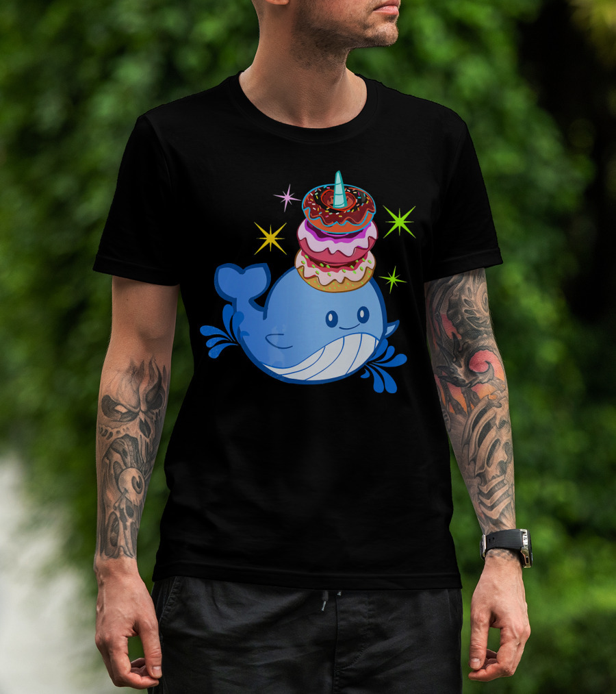 The Cute Narwhal Balancing Colorful Donuts T-shirt is designed for everyday wear and a consistent fit. Fabric is pre-shrunk ring-spun cotton with durable stitching. See the size chart below for exact measurements.