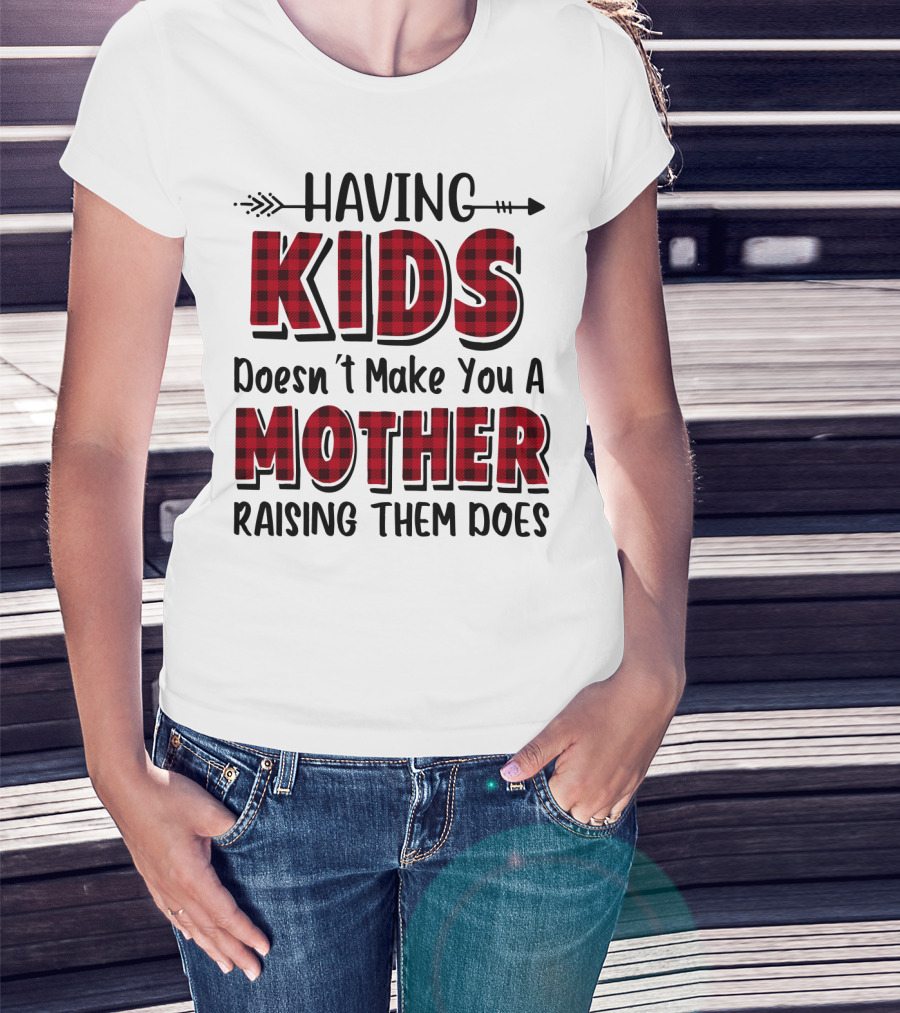 Having Kids Doesn't Make You A Mother Raising Them Does Plaid Text With Arrow T-Shirt