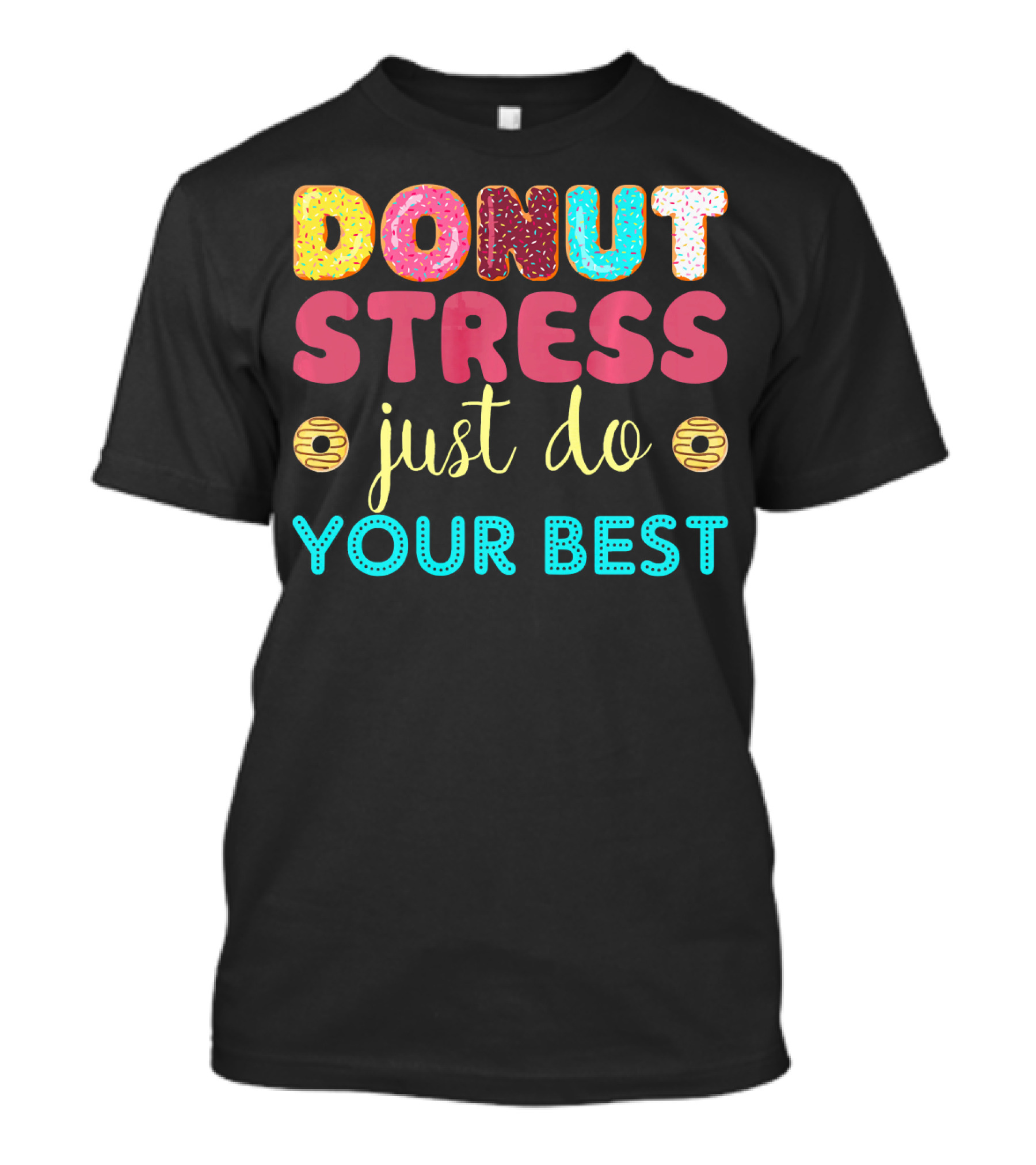 The DONUT STRESS JUST DO YOUR BEST Donut Icons T-shirt is designed for everyday wear and a consistent fit. Fabric is pre-shrunk ring-spun cotton with durable stitching. See the size chart below for exact measurements.