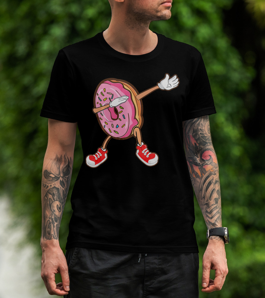The Dabbing Strawberry Frosted Donut with Sprinkles and Red Sneakers T-shirt is designed for everyday wear and a consistent fit. Fabric is pre-shrunk ring-spun cotton with durable stitching. See the size chart below for exact measurements.