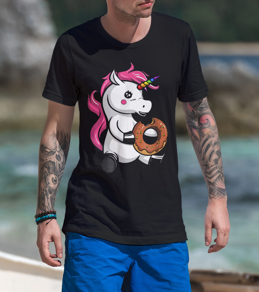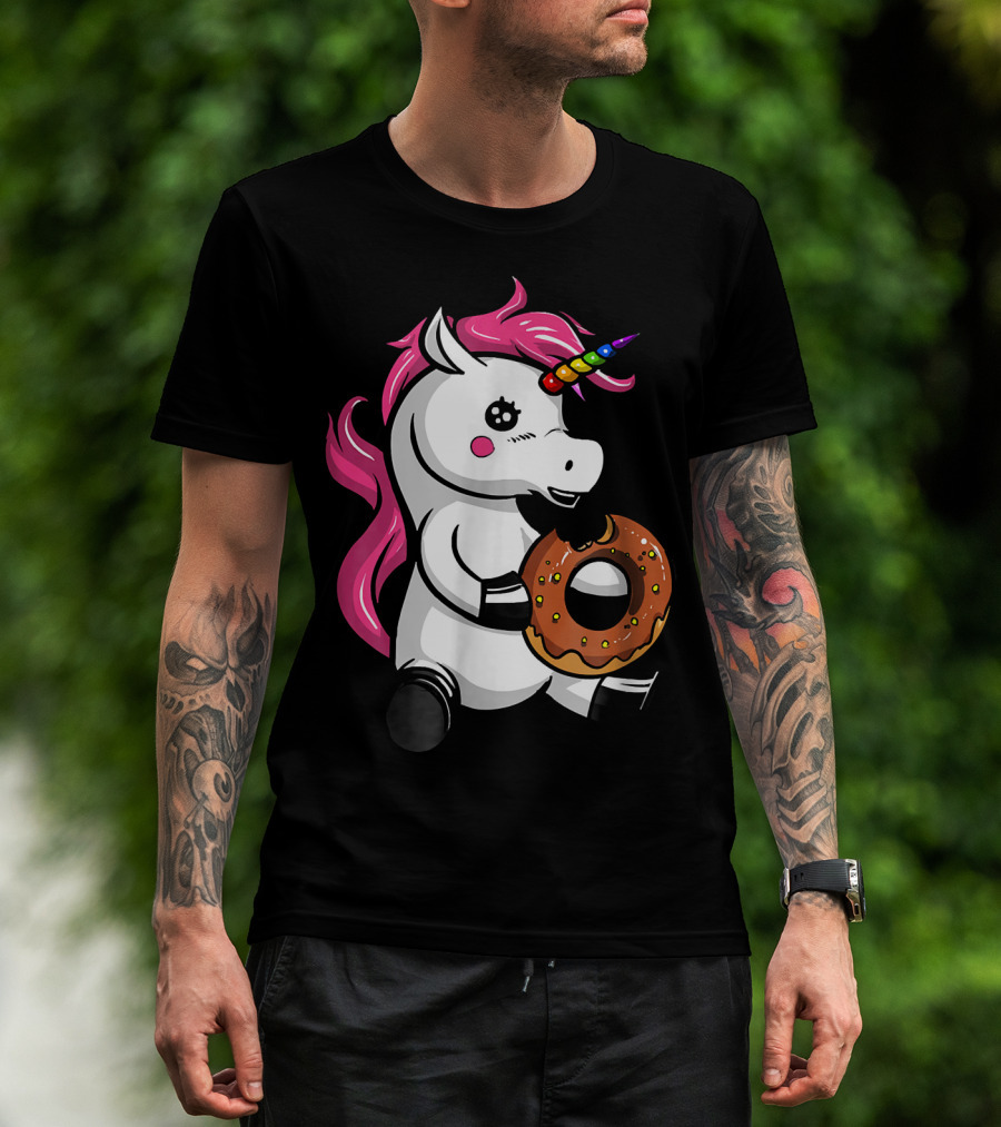Magical Unicorn With Rainbow Horn Enjoying Chocolate Donut T-Shirt