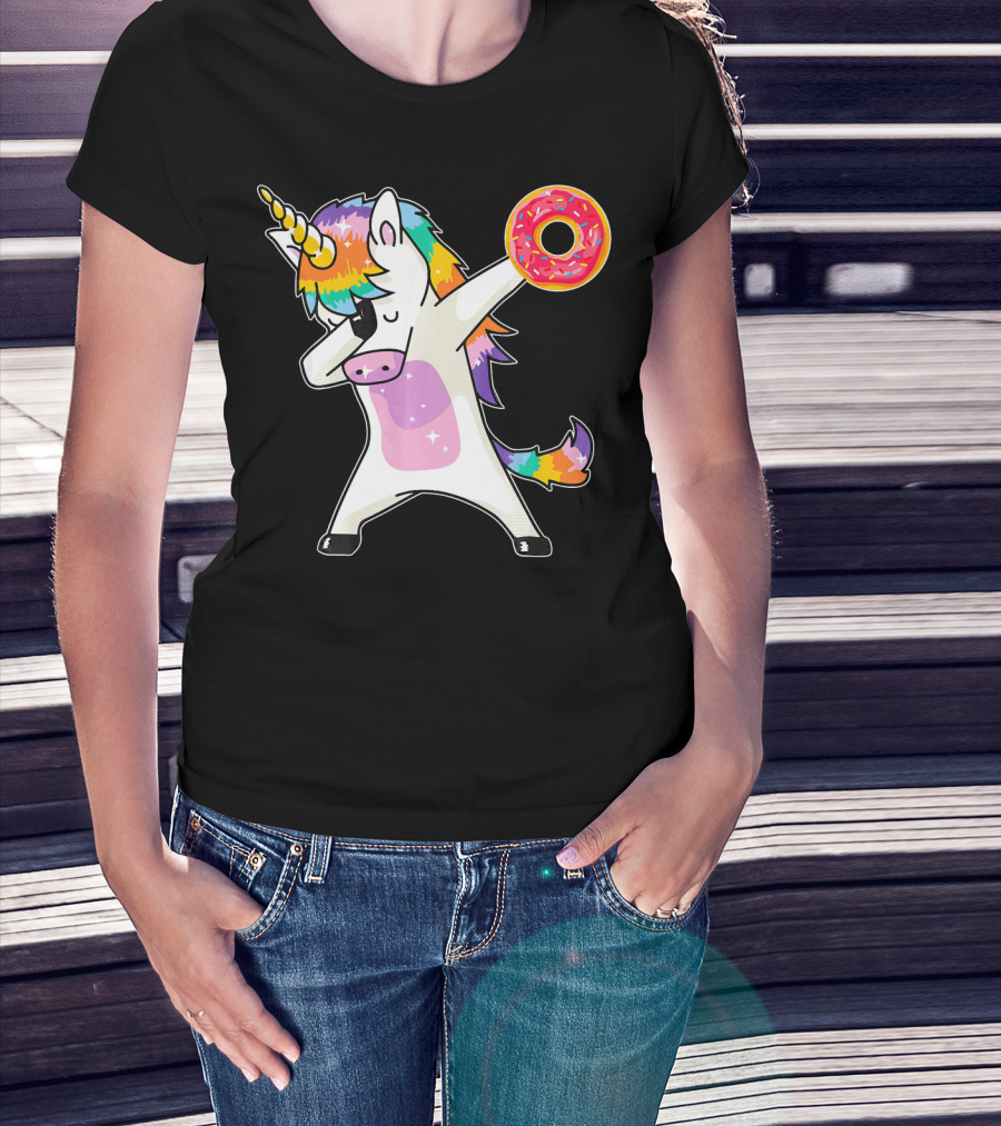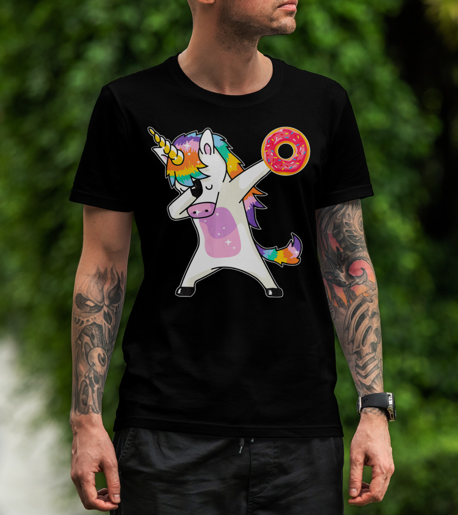 The Cute Dabbing Rainbow Unicorn Holding Doughnut Donut T-shirt is designed for everyday wear and a consistent fit. Fabric is pre-shrunk ring-spun cotton with durable stitching. See the size chart below for exact measurements.