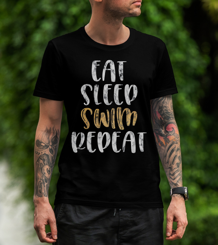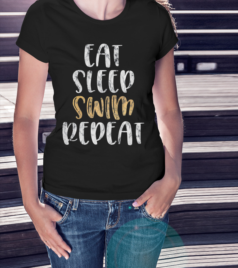 The Eat Sleep Swim Repeat T-shirt is designed for everyday wear and a consistent fit. Fabric is pre-shrunk ring-spun cotton with durable stitching. See the size chart below for exact measurements.