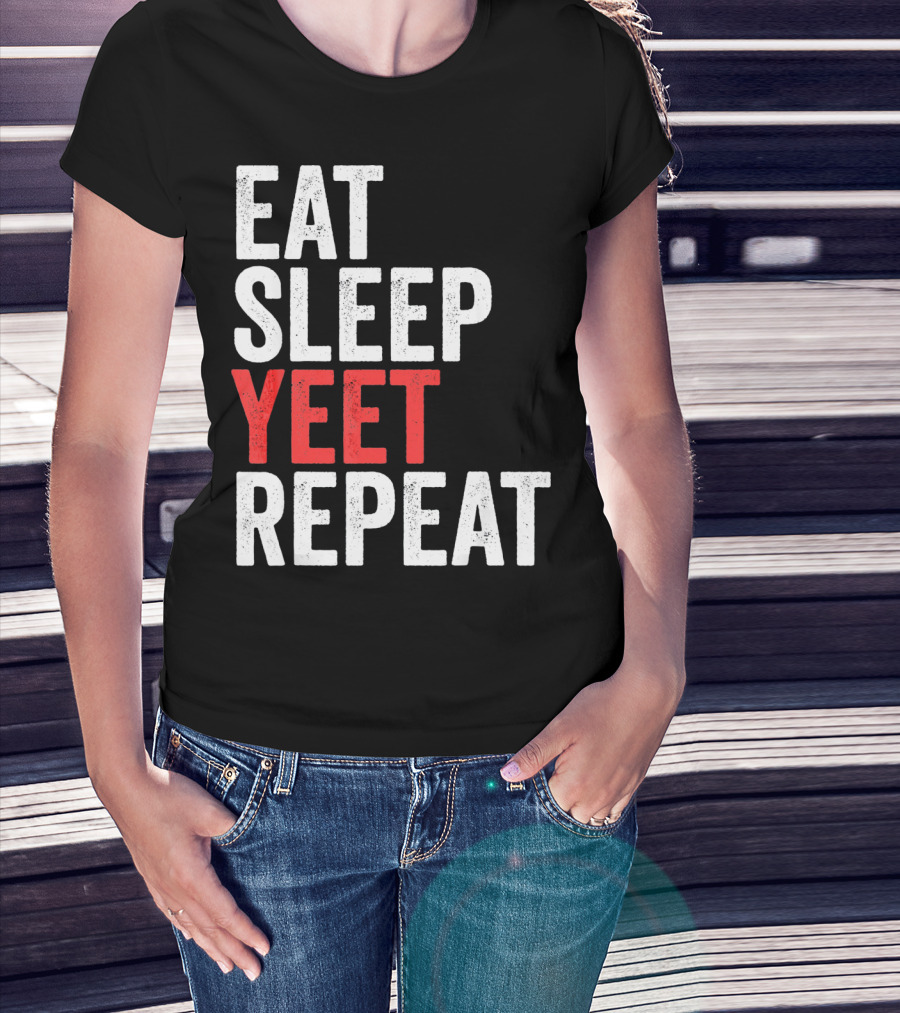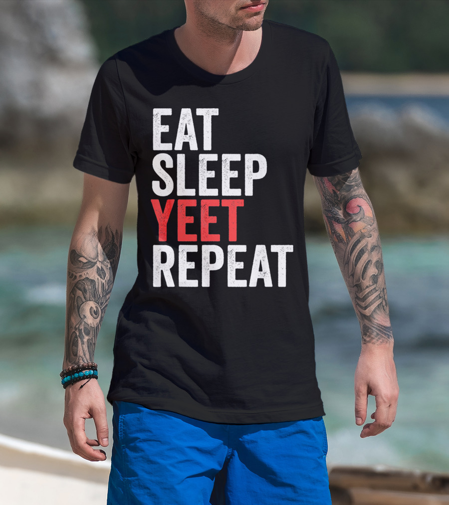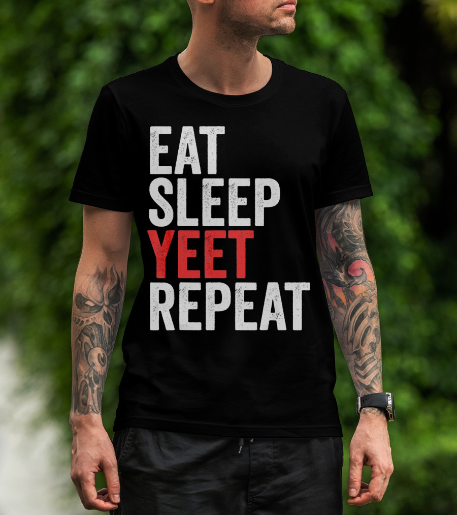 The Eat Sleep Yeet Repeat Catchphrase Gamer Meme Popular T-shirt is designed for everyday wear and a consistent fit. Fabric is pre-shrunk ring-spun cotton with durable stitching. See the size chart below for exact measurements.