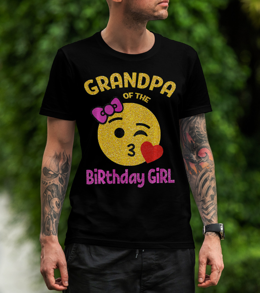 Grandpa Of The Birthday Girl Glitter Emoji Pink Bow Heart Kiss T-Shirt