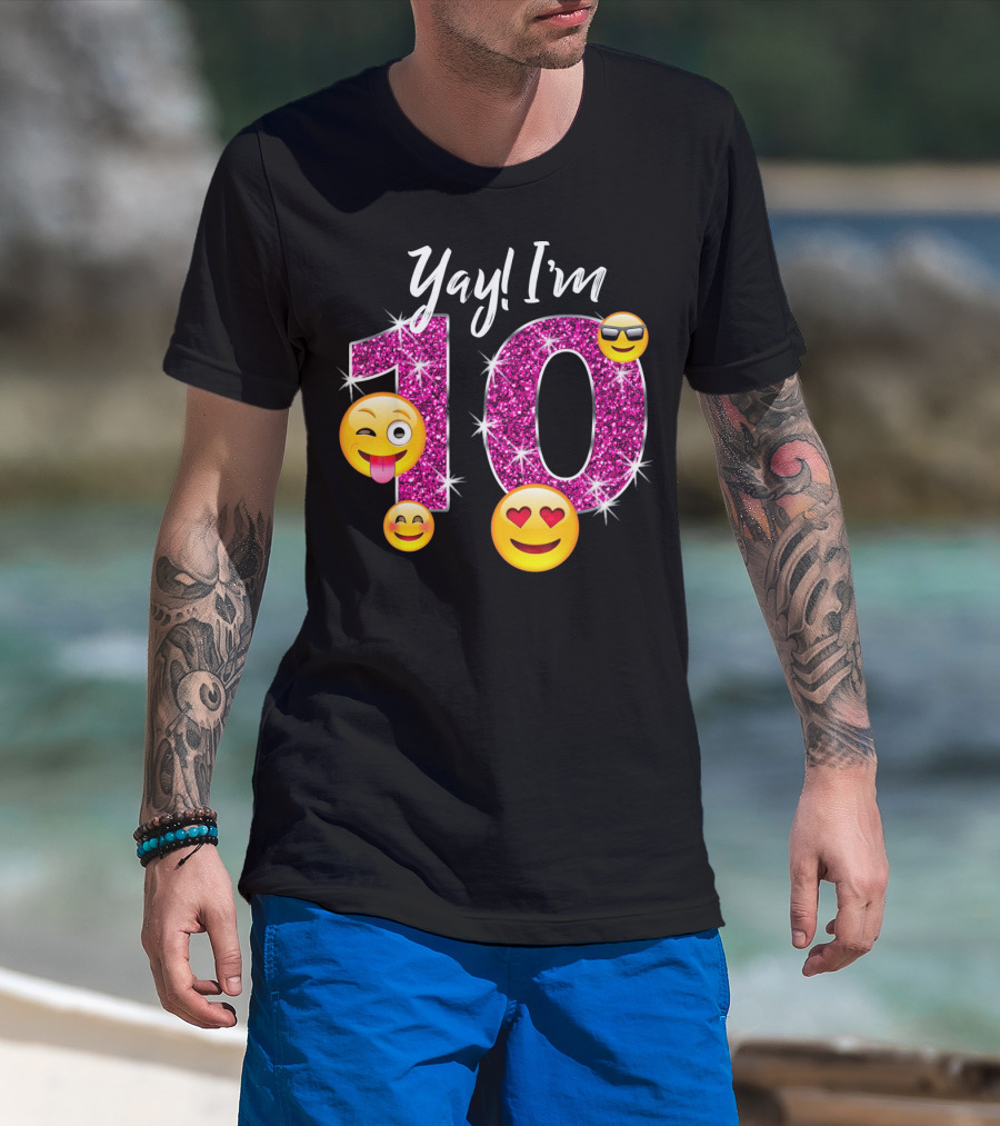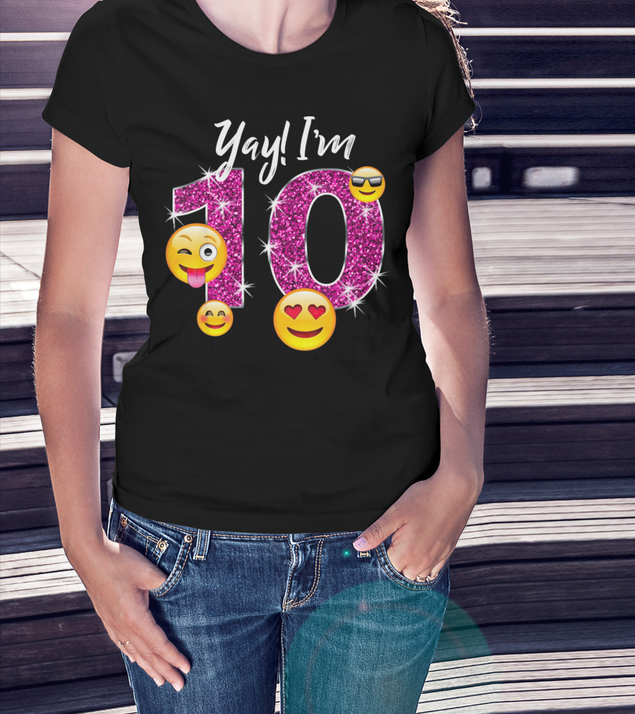 Yay I'm 10 Funny Emoji Birthday Celebration With Sparkly Pink Number And Smiling Faces T-Shirt