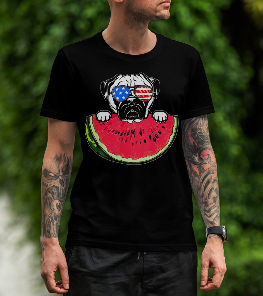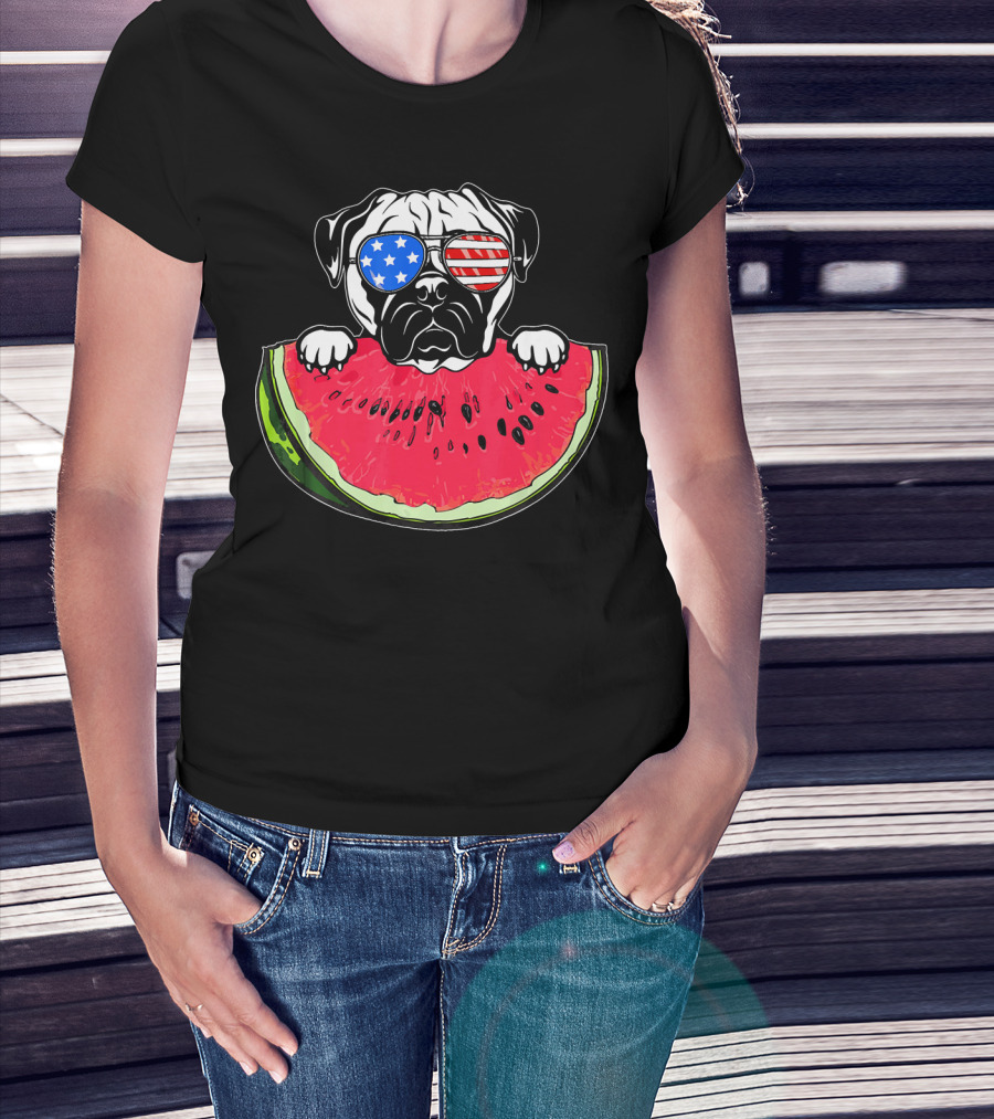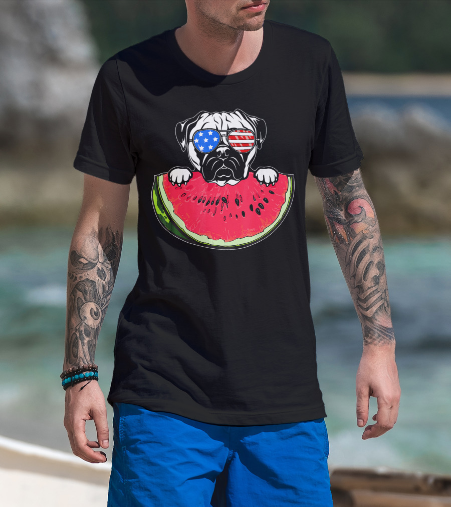 Funny Watermelon Day Pug American Flag Glasses T-Shirt