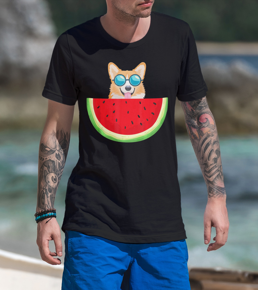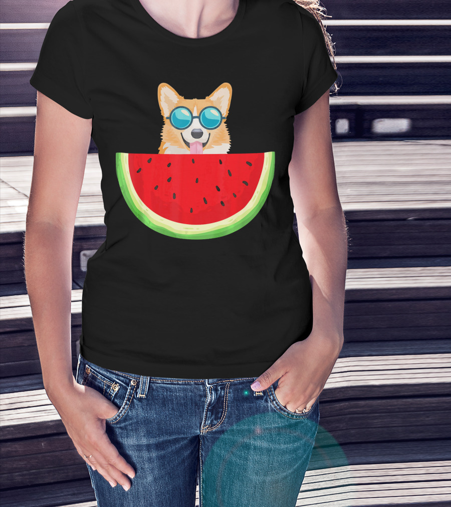 The Corgi With Sunglasses and Watermelon Slice Womens T-shirt is designed for everyday wear and a consistent fit. Fabric is pre-shrunk ring-spun cotton with durable stitching. See the size chart below for exact measurements.