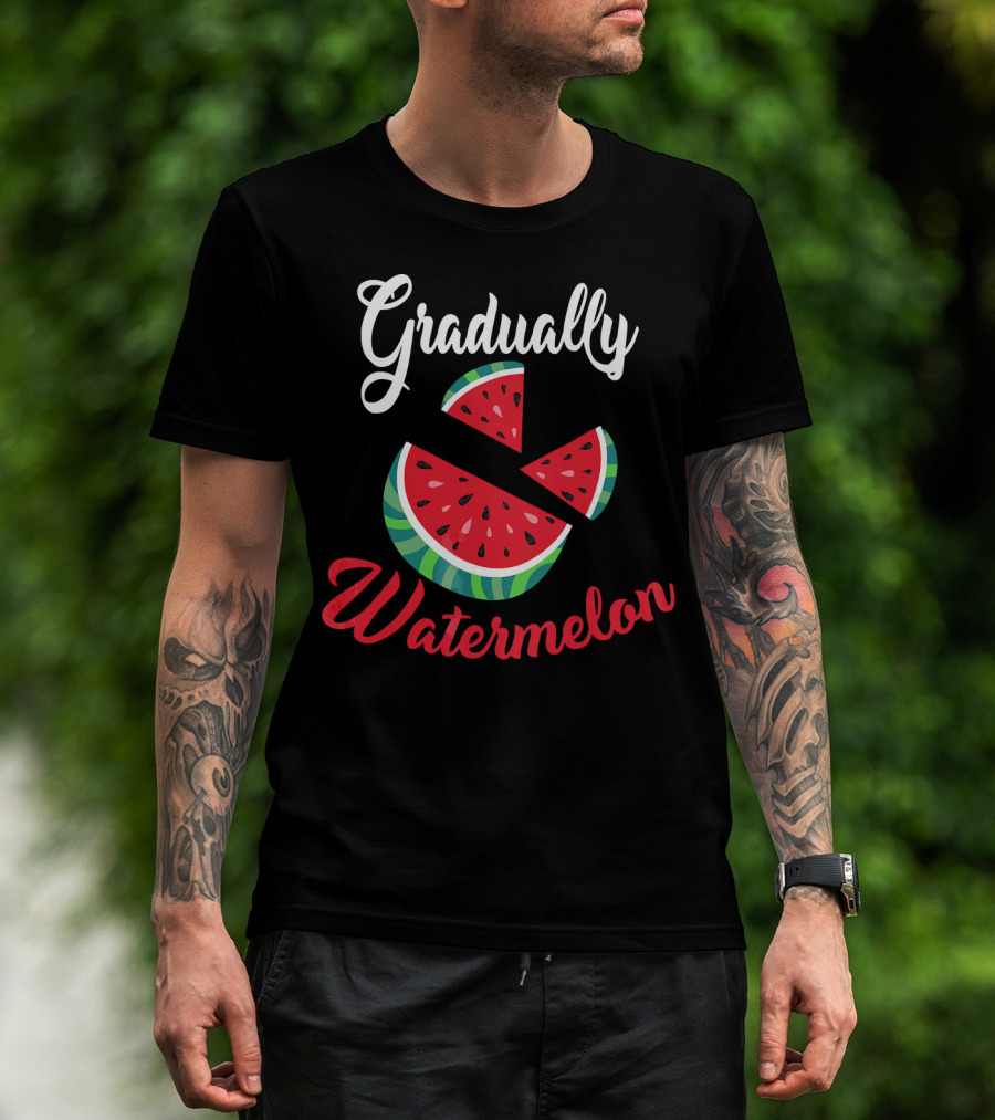 The Gradually Watermelon Watermelon Slice T-shirt is designed for everyday wear and a consistent fit. Fabric is pre-shrunk ring-spun cotton with durable stitching. See the size chart below for exact measurements.