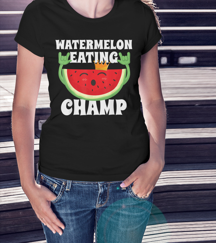 The Watermelon Eating Champ Melon Contest Co King with Crown Celebrating Victory T-shirt is designed for everyday wear and a consistent fit. Fabric is pre-shrunk ring-spun cotton with durable stitching. See the size chart below for exact measurements.