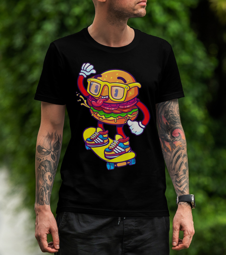 Skateboarding Cheeseburger Cartoon With Glasses And Sneakers T-Shirt