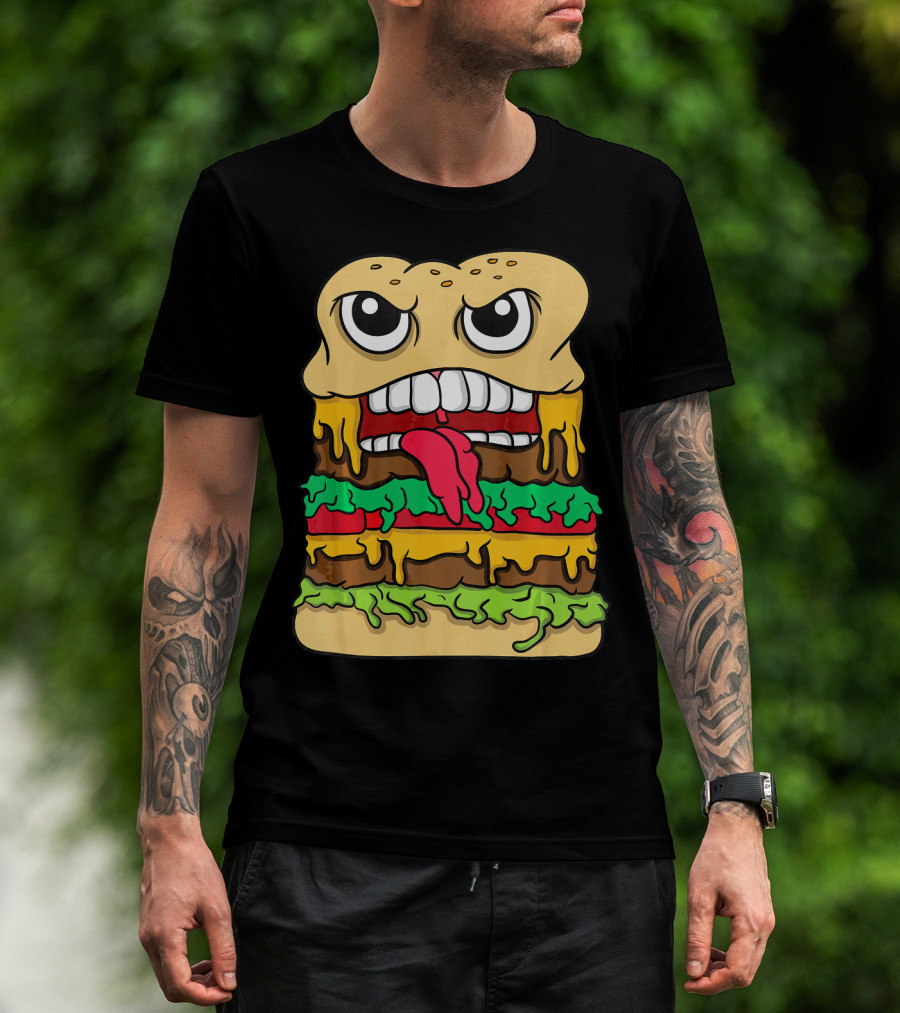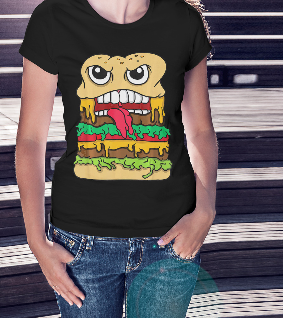 The Burger Hamburger Cheeseburger Face with Tongue Out Lettuce and Cheese Layers T-shirt is designed for everyday wear and a consistent fit. Fabric is pre-shrunk ring-spun cotton with durable stitching. See the size chart below for exact measurements.