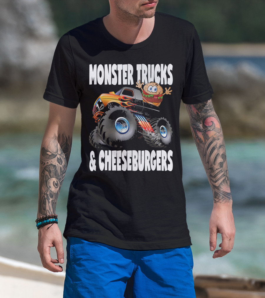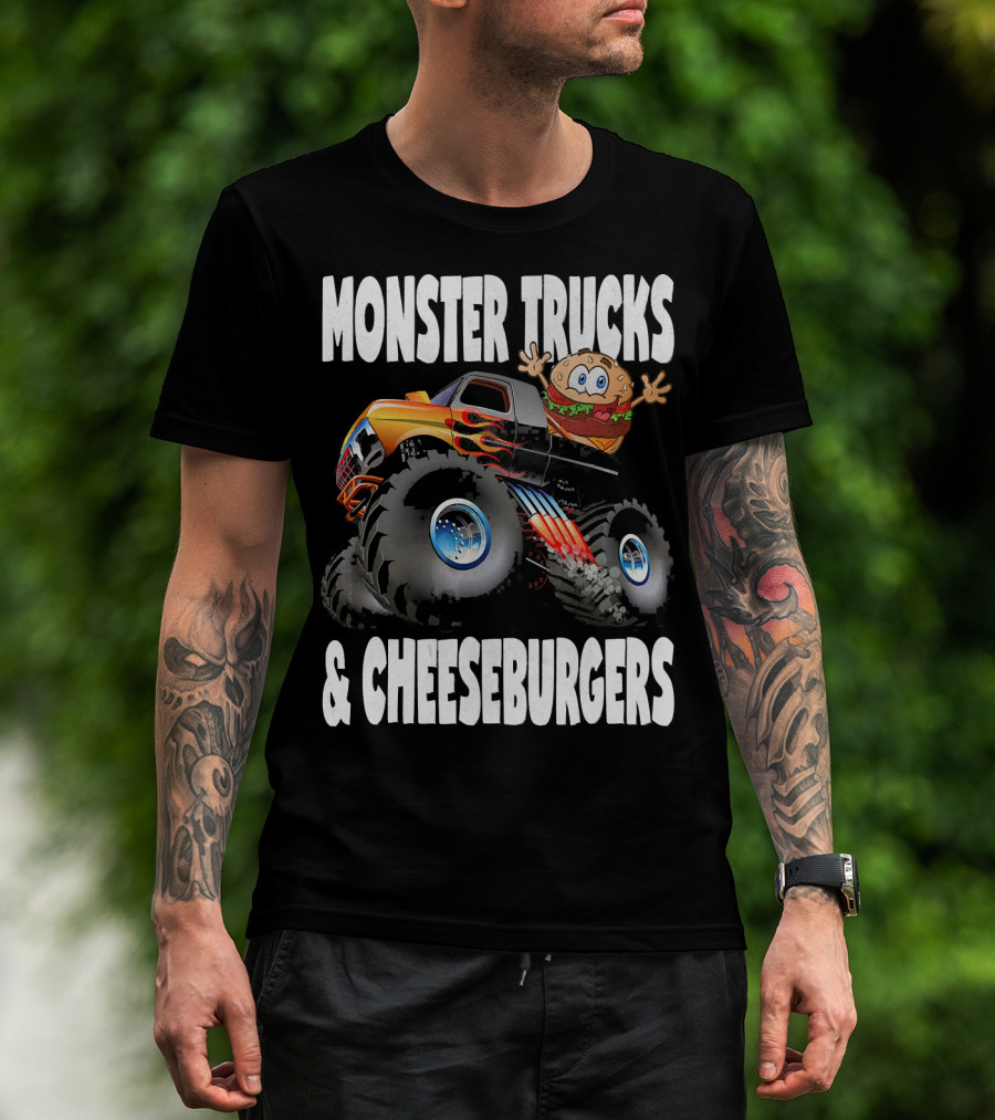 Monster Trucks And Cheeseburgers With Cartoon Cheeseburger Driver T-Shirt