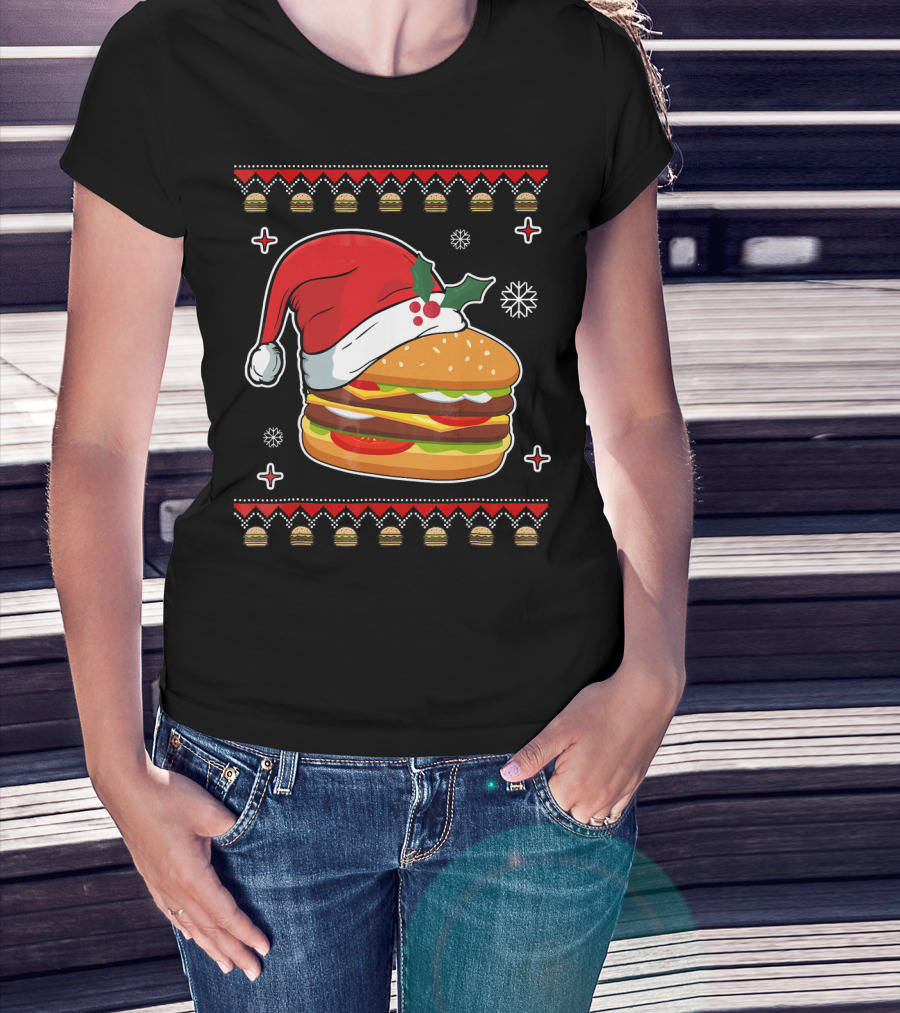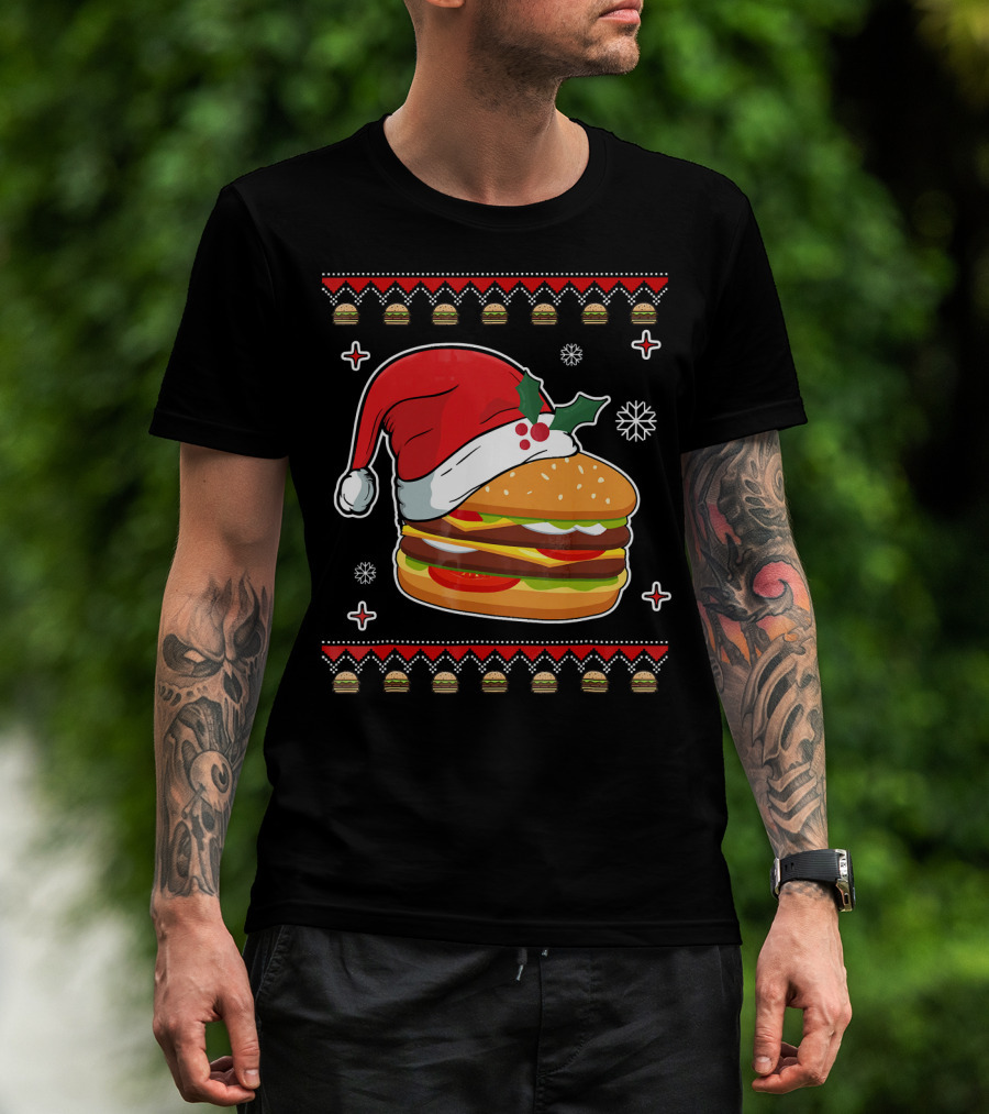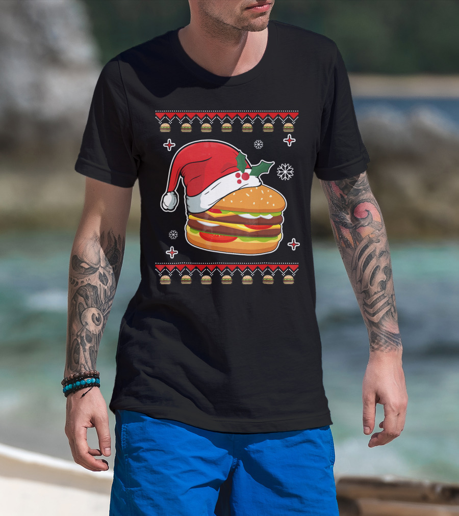 Santa Hat Hamburger Christmas Ugly T-Shirt
