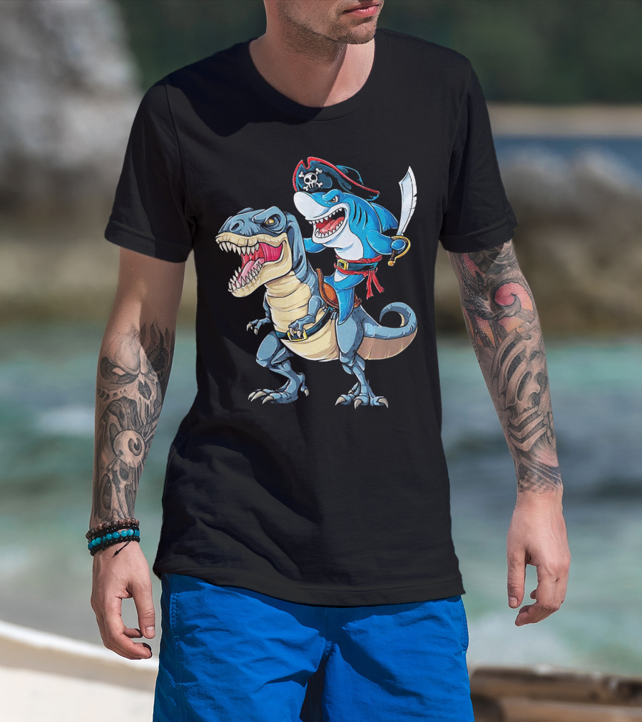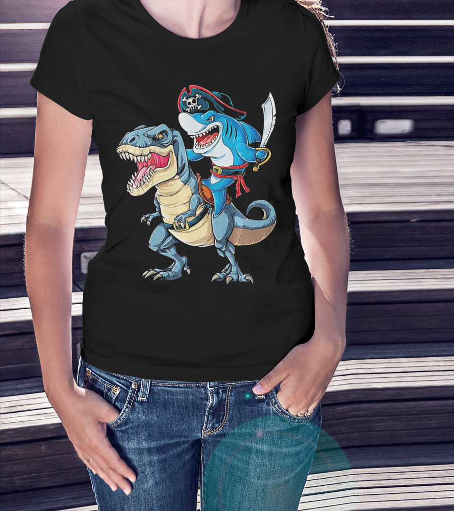 Pirate Shark Wielding Sword Riding Rex Dinosaur T-Shirt