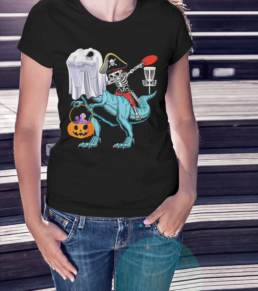 Dab Jolly Roger Skeleton Pirate On Dinosaur With Ghost Pumpkin And Frisbee T-Shirt