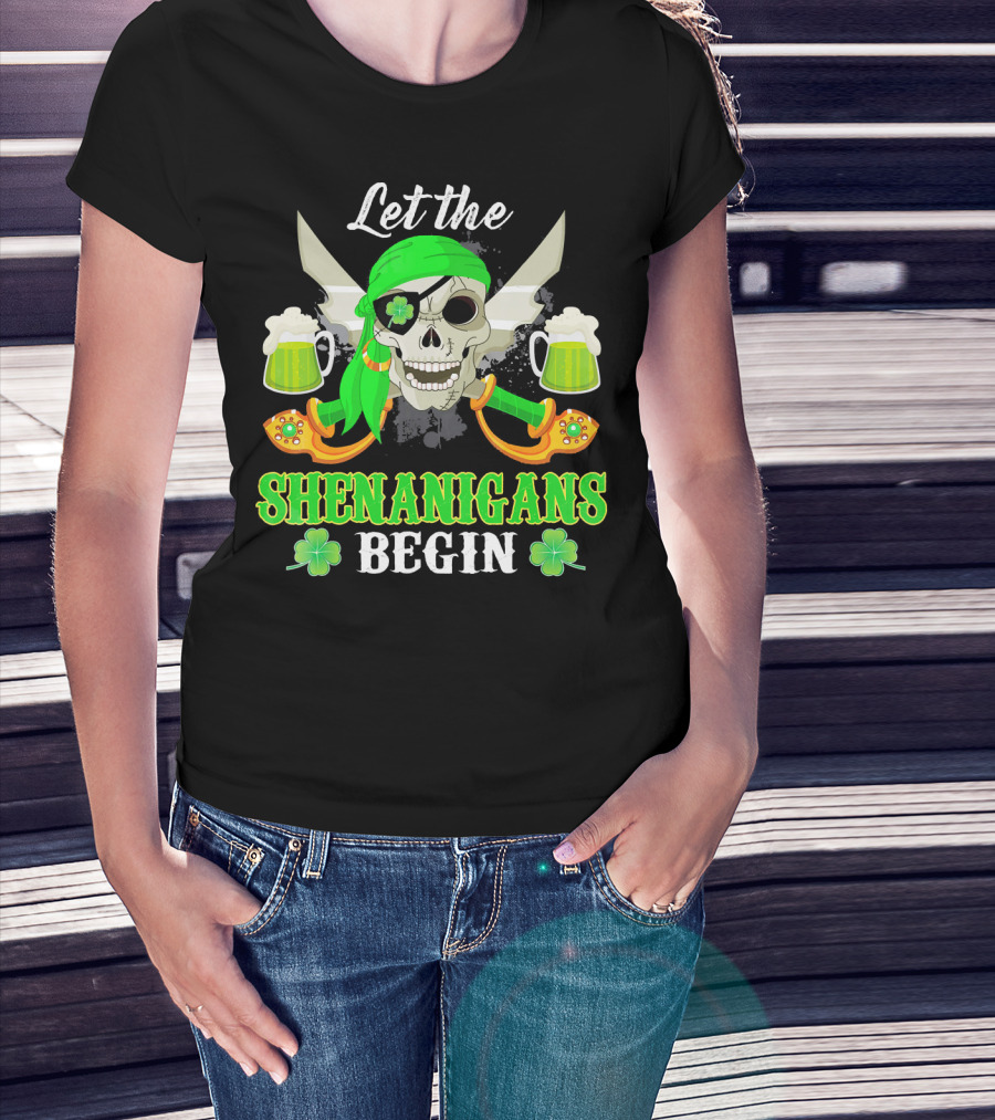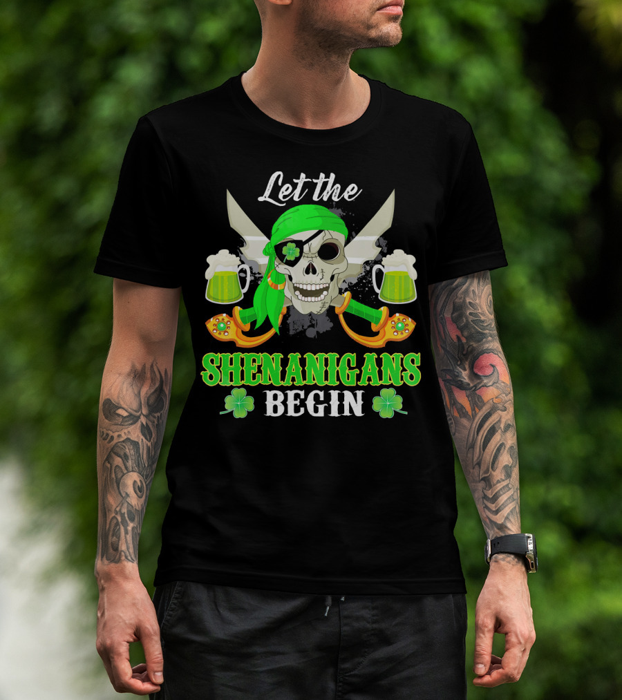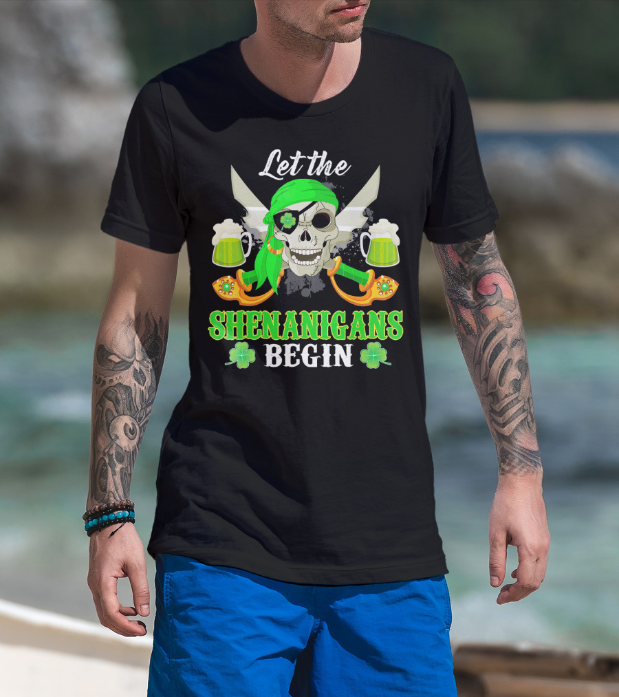 Let The Shenanigans Begin Skull Pirate With Swords And Shamrocks T-Shirt