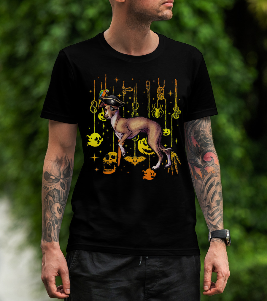 Italian Greyhound Pirate Dog With Halloween Ghosts And Skulls T-Shirt