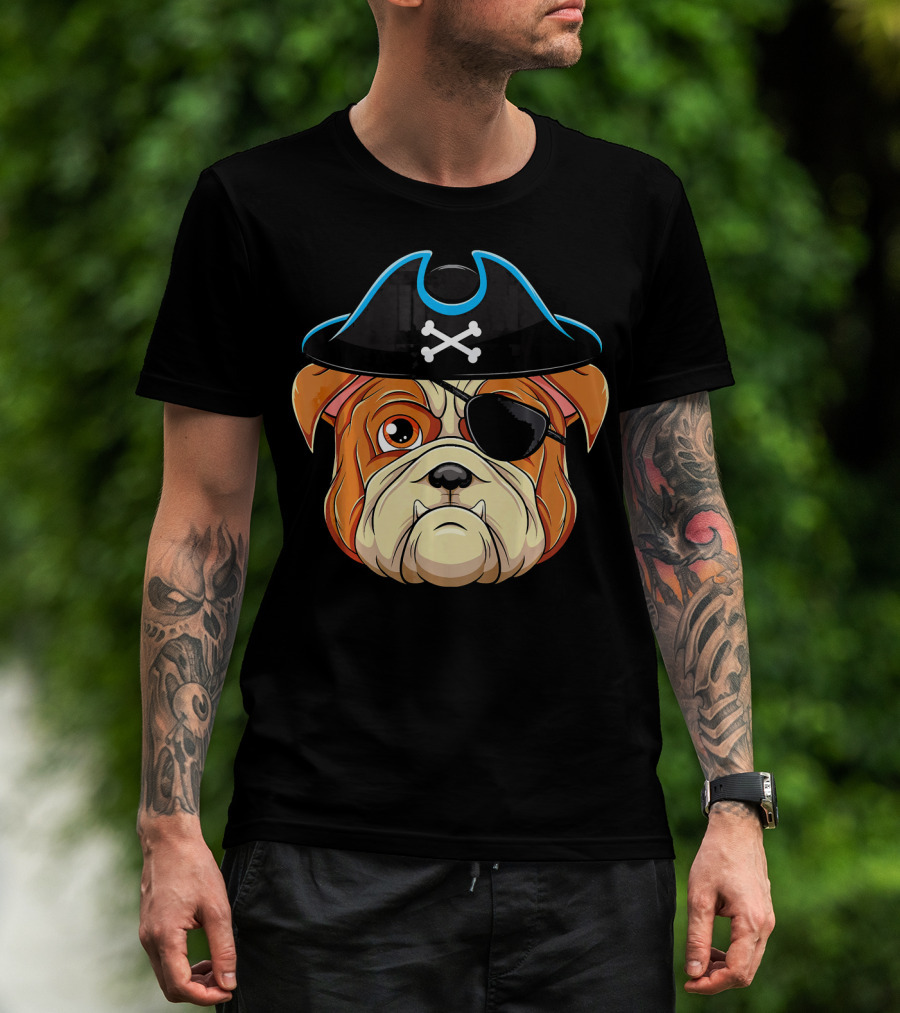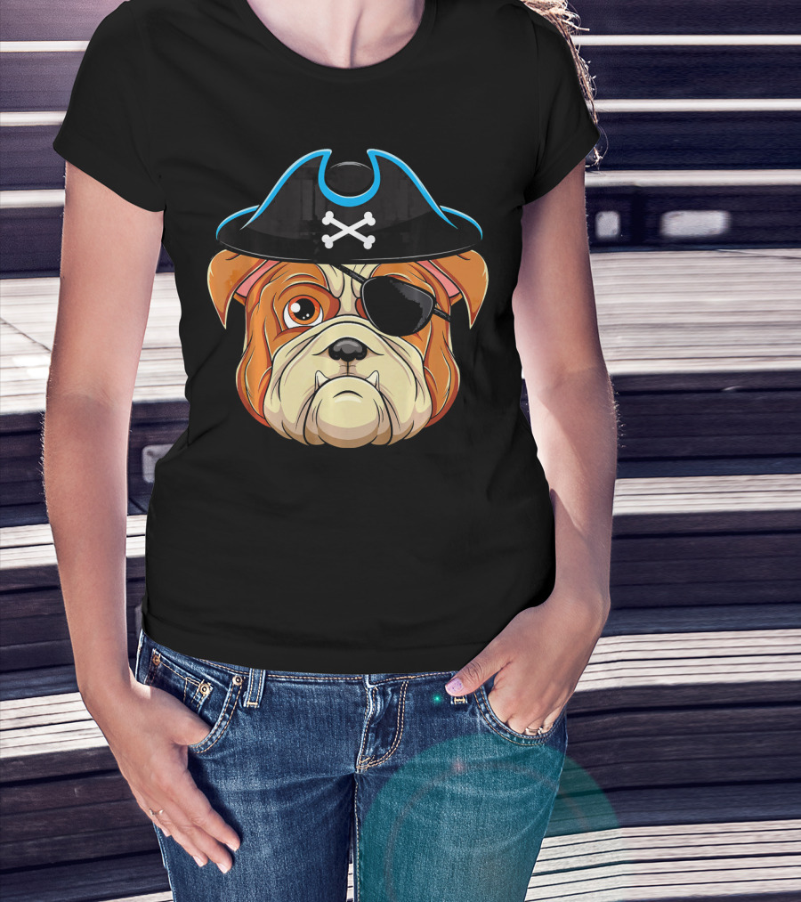 English Bulldog Pirate Hat Eye Patch Skull Crossbones T-Shirt