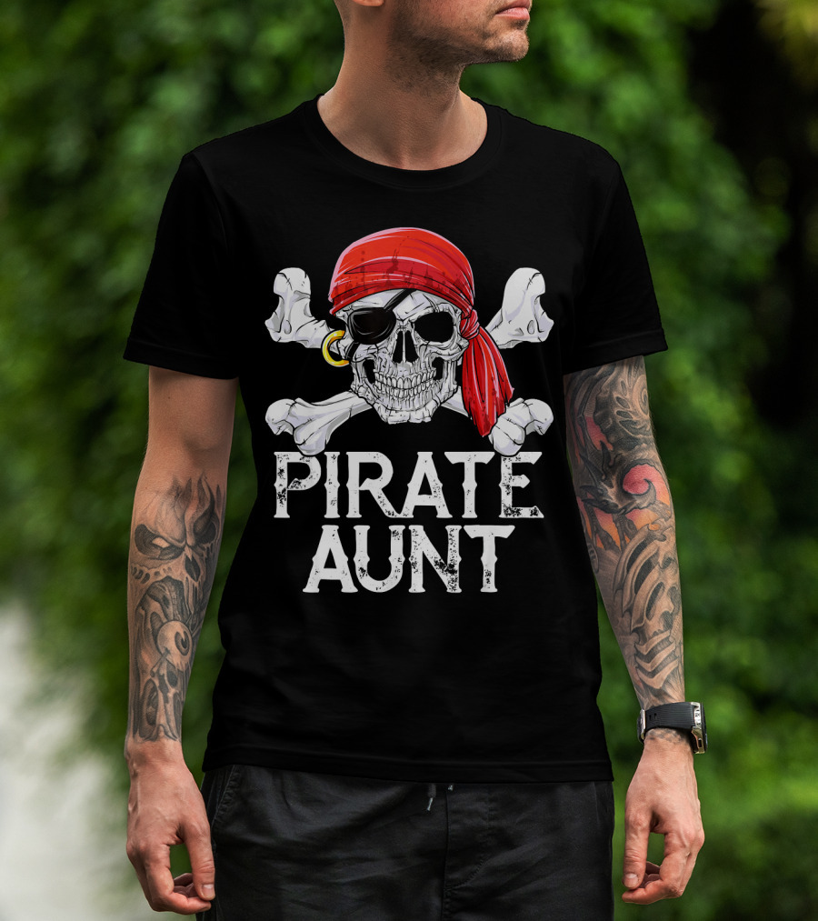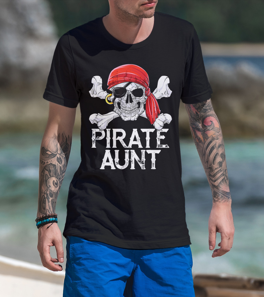 Pirate Aunt Skull Crossbones Red Bandana Eyepatch Jolly Roger Flag T-Shirt