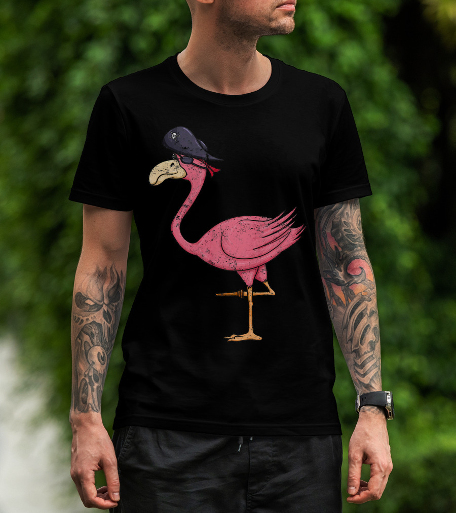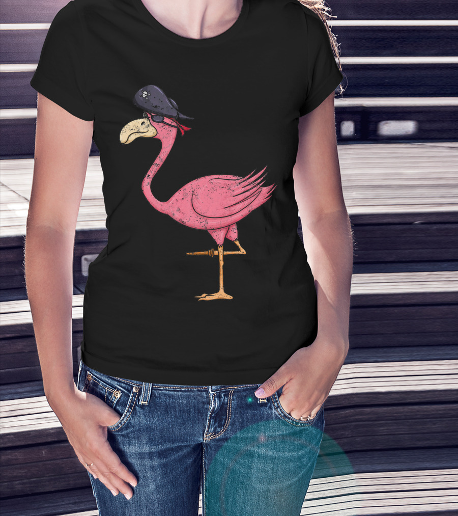 Vintage Pink Flamingo Pirate With Eyepatch And Skull Hat T-Shirt