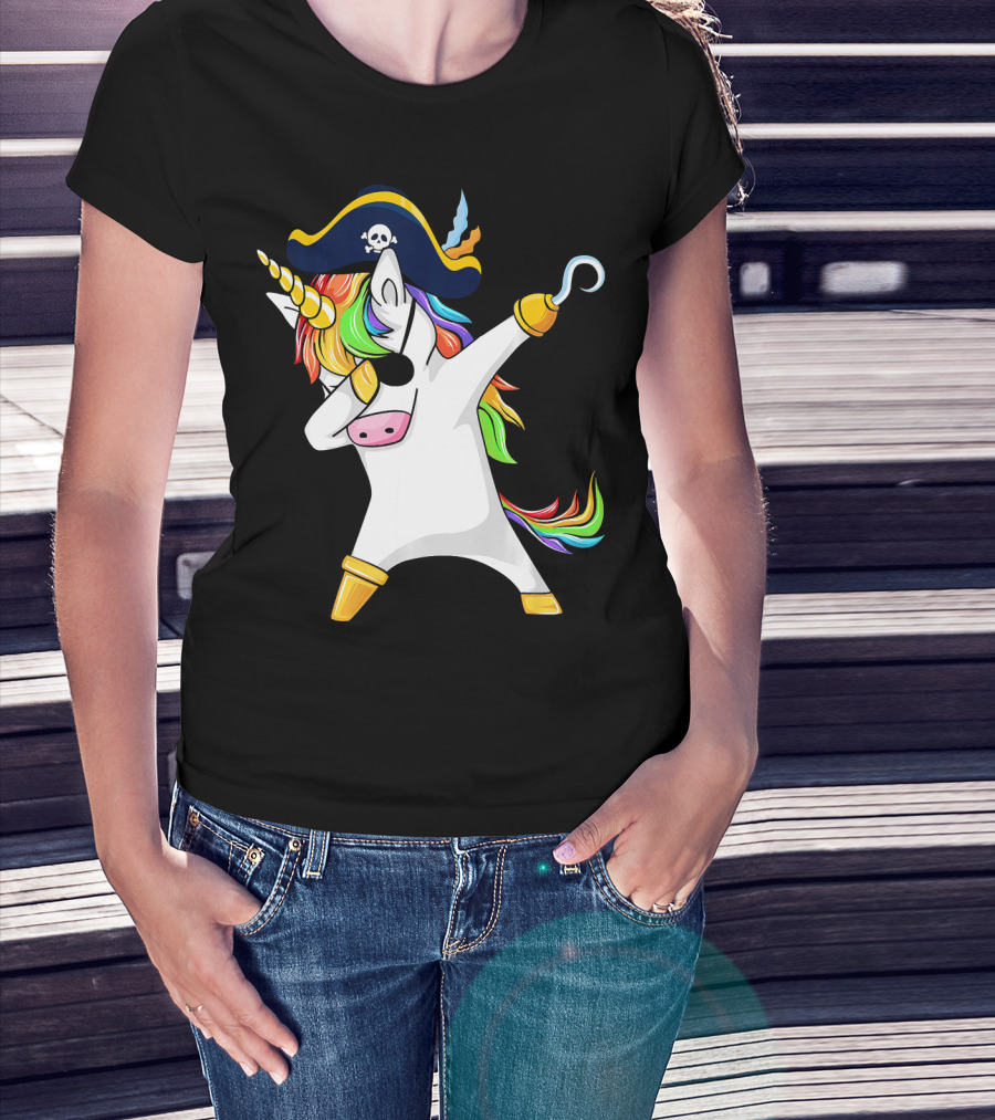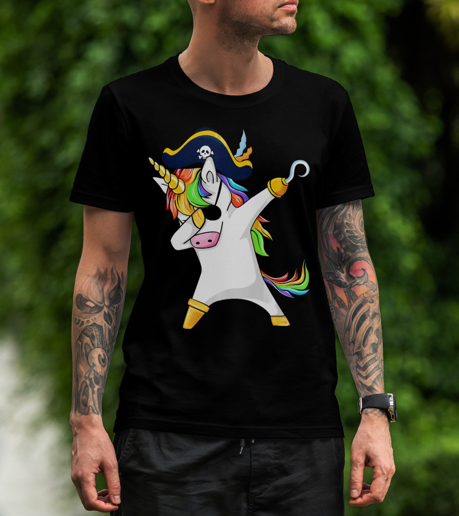 Funny Dabbing Unicorn Pirate With Rainbow Hair And Skull Hat T-Shirt