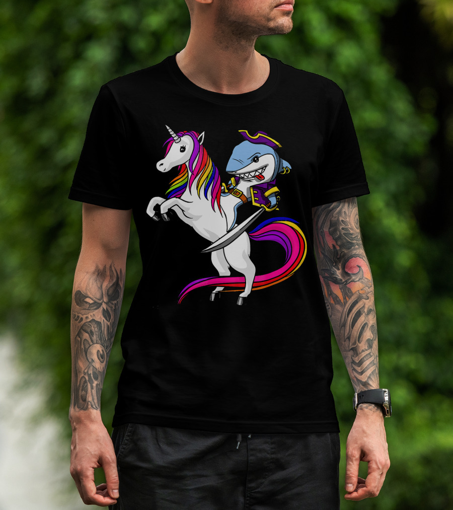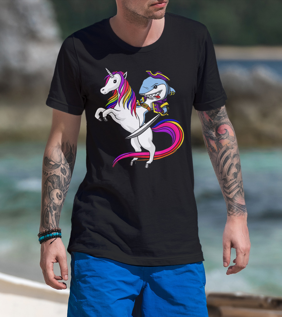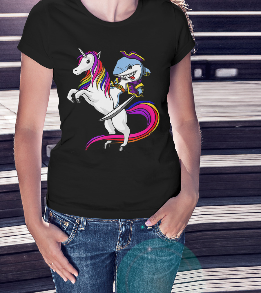 Shark Pirate Riding Rainbow Unicorn Magical Adventure T-Shirt