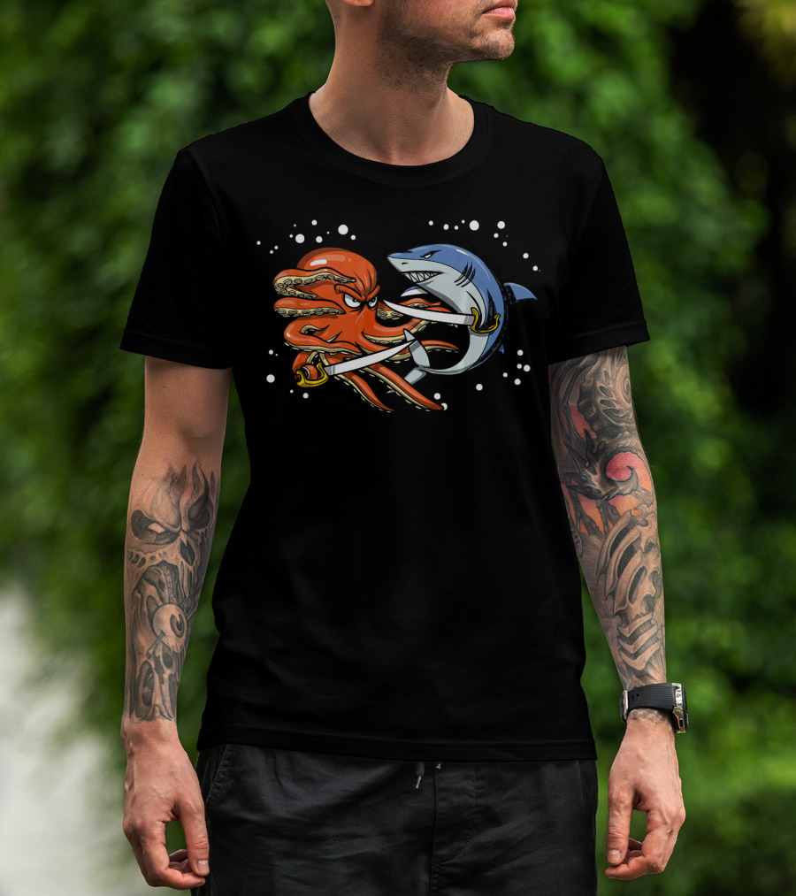Shark Pirate Vs. Octopus Sailor Captain Sword Battle T-Shirt