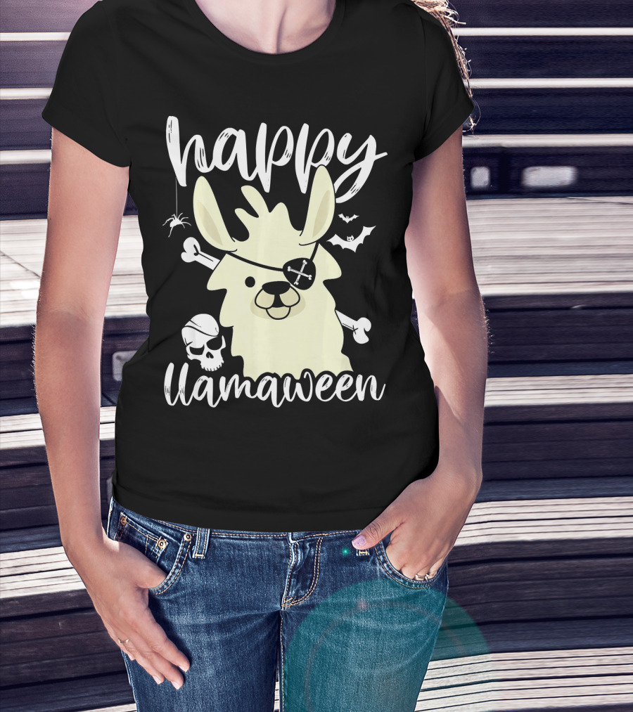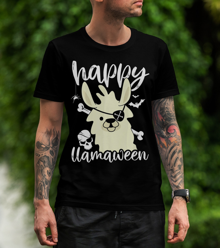 Happy Llamaween Llama Pirate Bats Skull T-Shirt