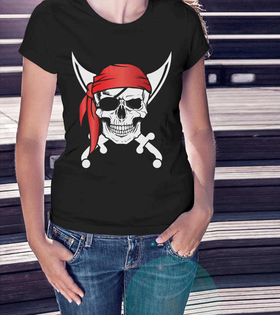 The Pirate Skull Red Bandana Crossed Knives Iconic T-shirt is designed for everyday wear and a consistent fit. Fabric is pre-shrunk ring-spun cotton with durable stitching. See the size chart below for exact measurements.