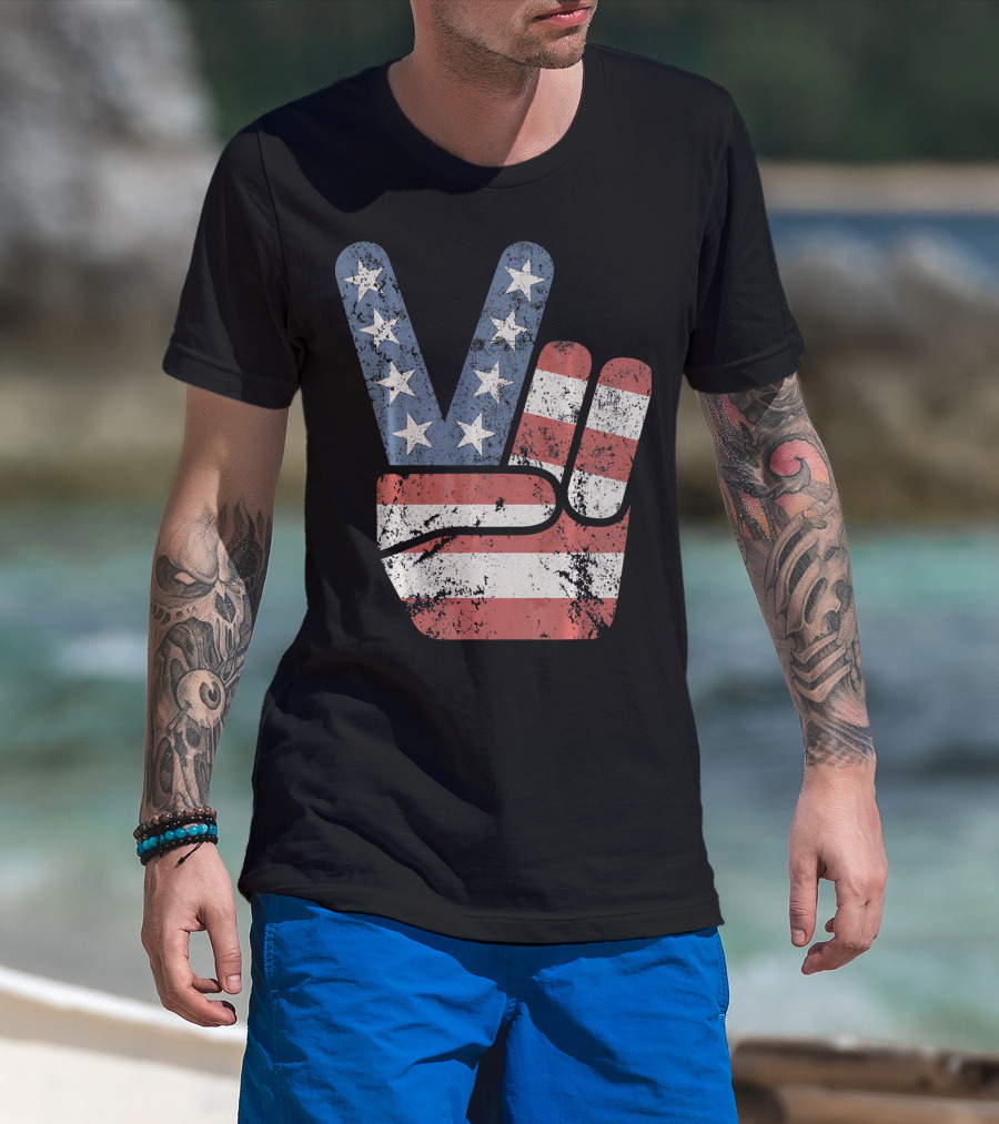 The Vintage USA American Flag Peace Sign T-shirt is designed for everyday wear and a consistent fit. Fabric is pre-shrunk ring-spun cotton with durable stitching. See the size chart below for exact measurements.