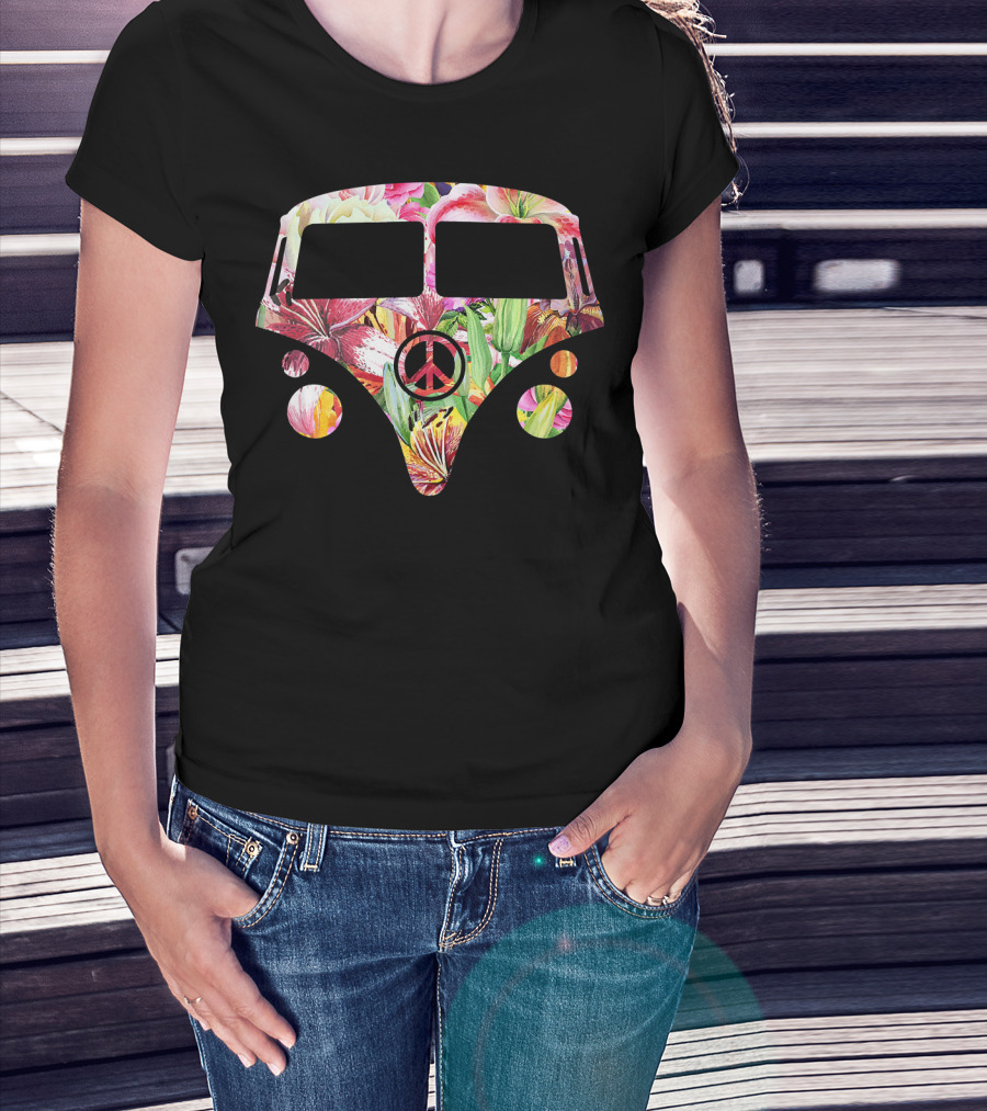 Peace Sign Floral Hippy Camper Van With Colorful Flower T-Shirt