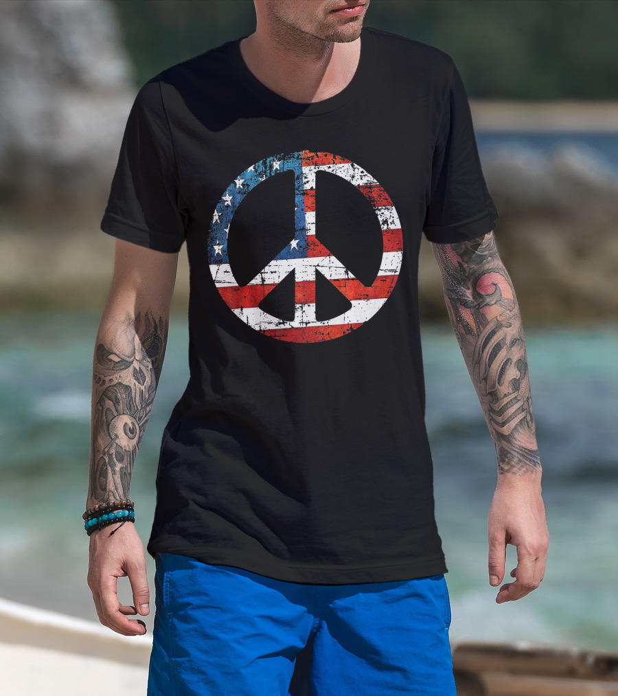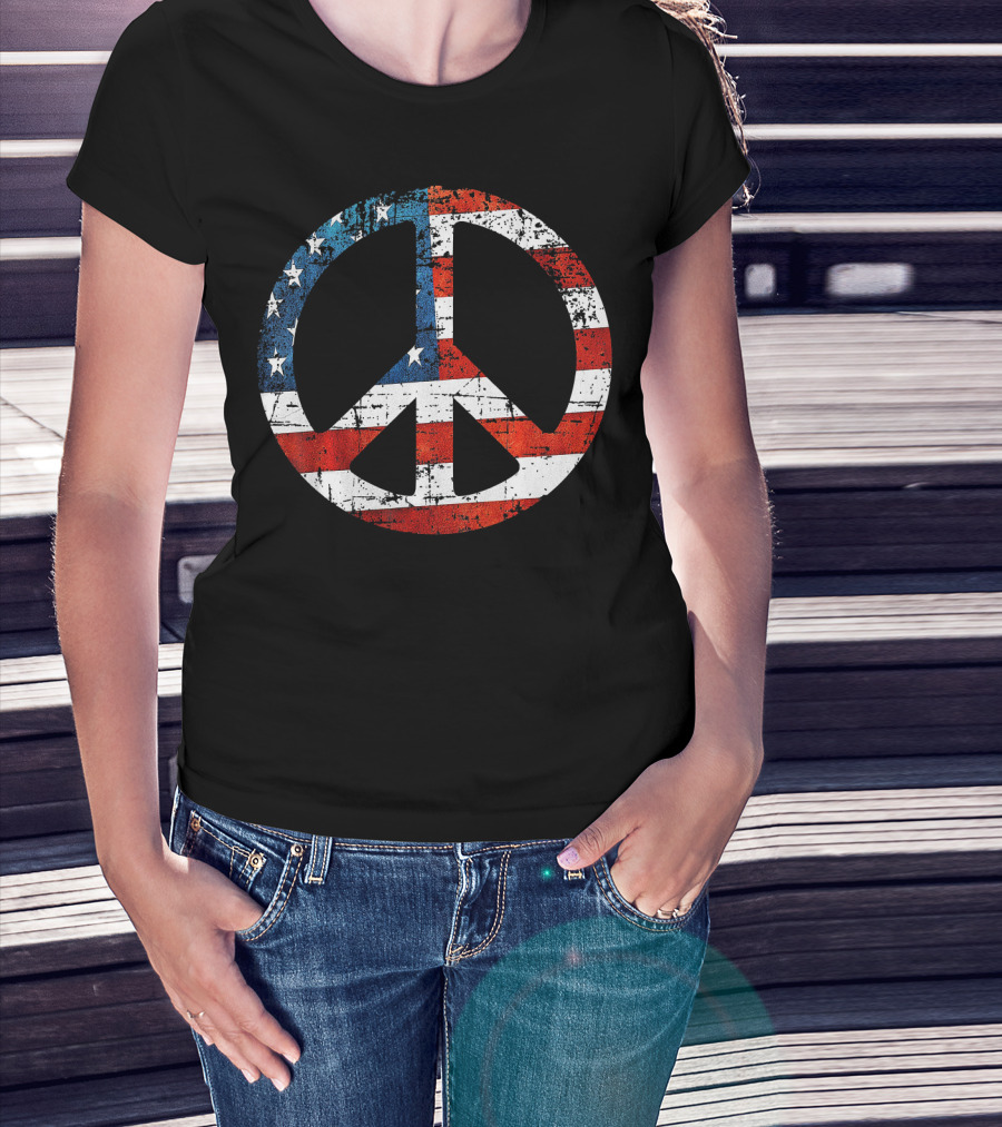 The Peace Sign American Flag USA Peac T-shirt is designed for everyday wear and a consistent fit. Fabric is pre-shrunk ring-spun cotton with durable stitching. See the size chart below for exact measurements.