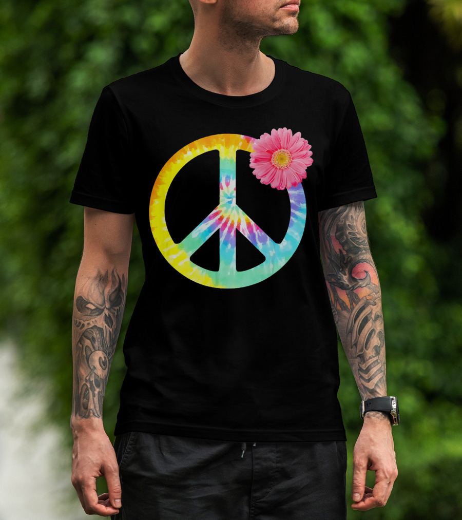 Boho Tie Dye Peace Sign With Pink Flower T-Shirt