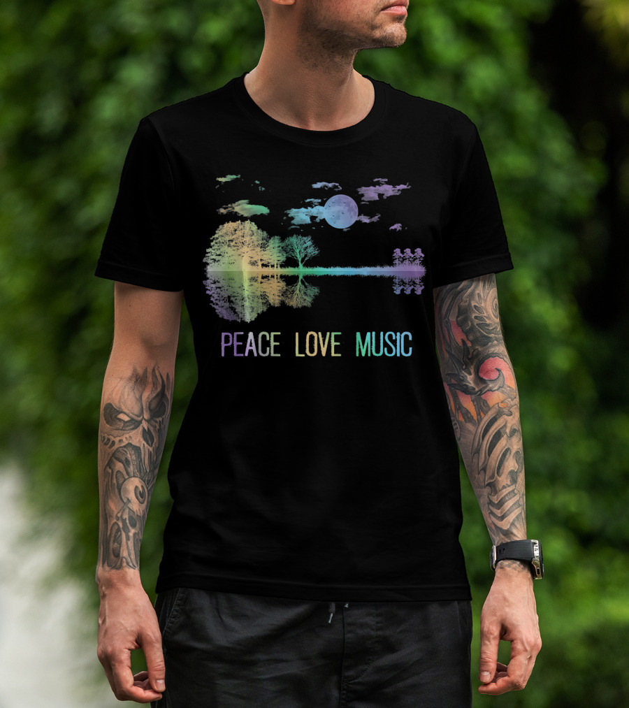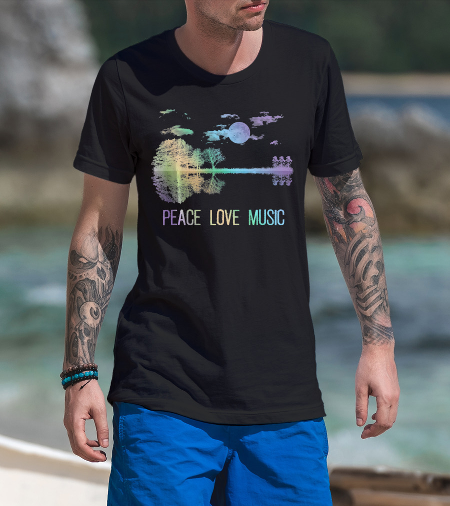 Peace Love Music Guitar Moon Lake Shadow Hippie T-Shirt